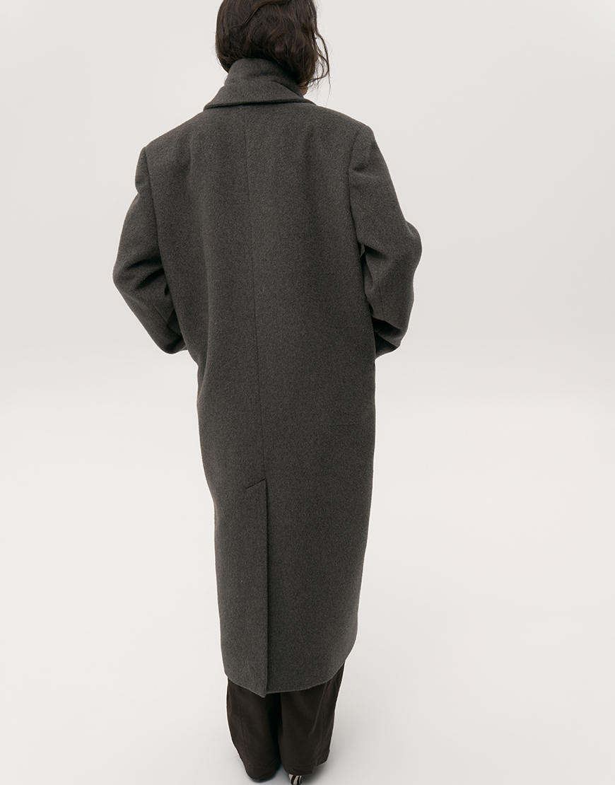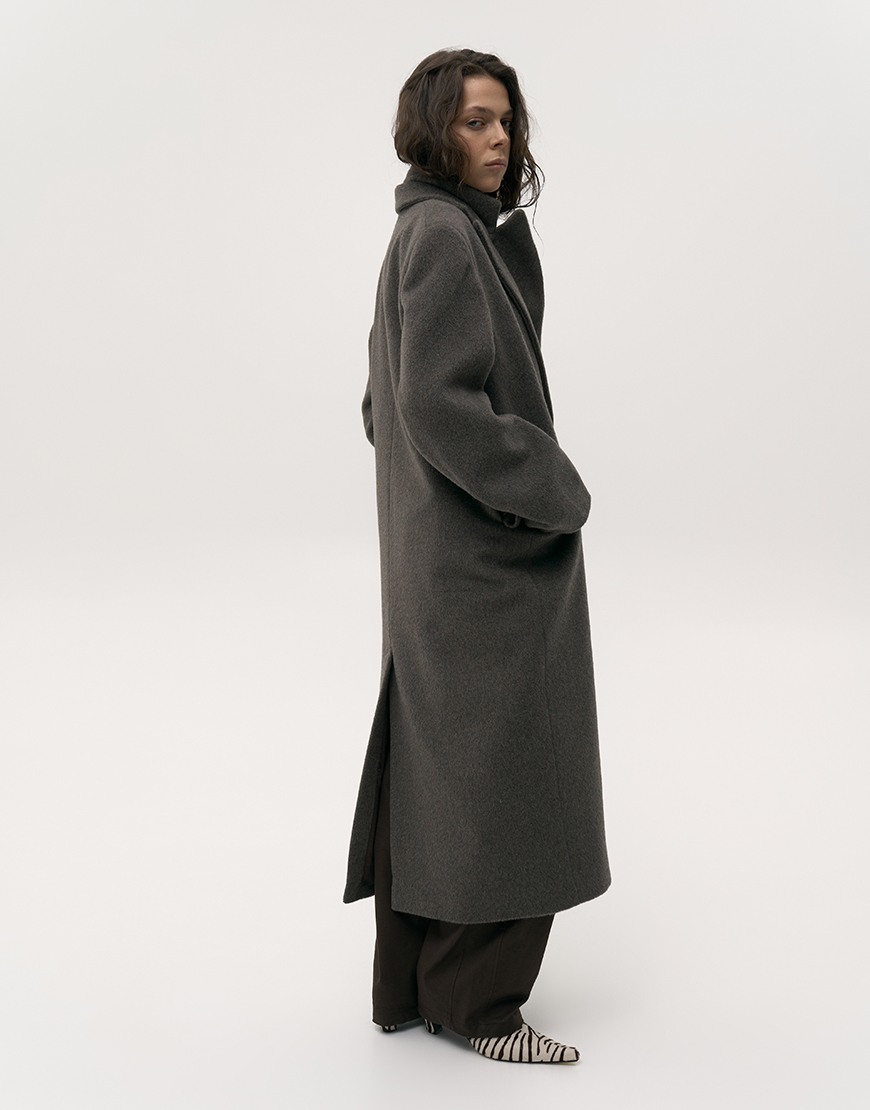 Доставка впродовж 5-12 робочих днівДвобортне пальто кольору мокко, виготовлене з високоякісної вовняної тканини з коротким ворсом, що забезпечує комфорт і тепло. Приємна на дотик текстура та особлива деталь у вигляді знімкового коміру, який повністю повторює форму латканів. Це дозволяє легко змінювати образ: від елегантного та класичного до більш розслабленого, без зайвих деталей.