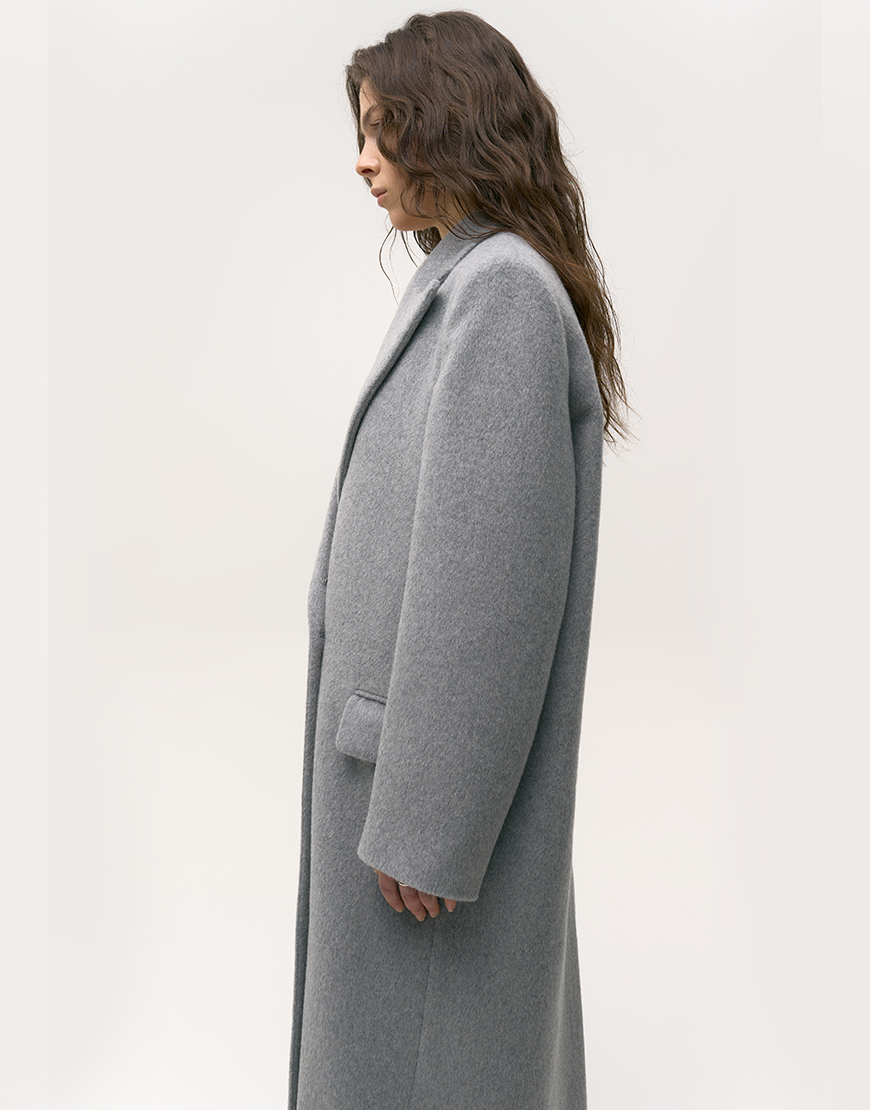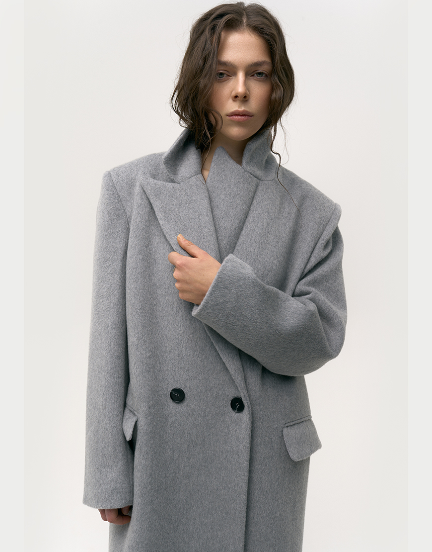 Доставка впродовж 5-12 робочих днівДвобортне світло-сіре пальто, виготовлене з високоякісної вовняної тканини з коротким ворсом, що забезпечує комфорт і тепло. Приємна на дотик текстура та особлива деталь у вигляді знімкового коміру, який повністю повторює форму латканів. Це дозволяє легко змінювати образ: від елегантного та класичного до більш розслабленого, без зайвих деталей.