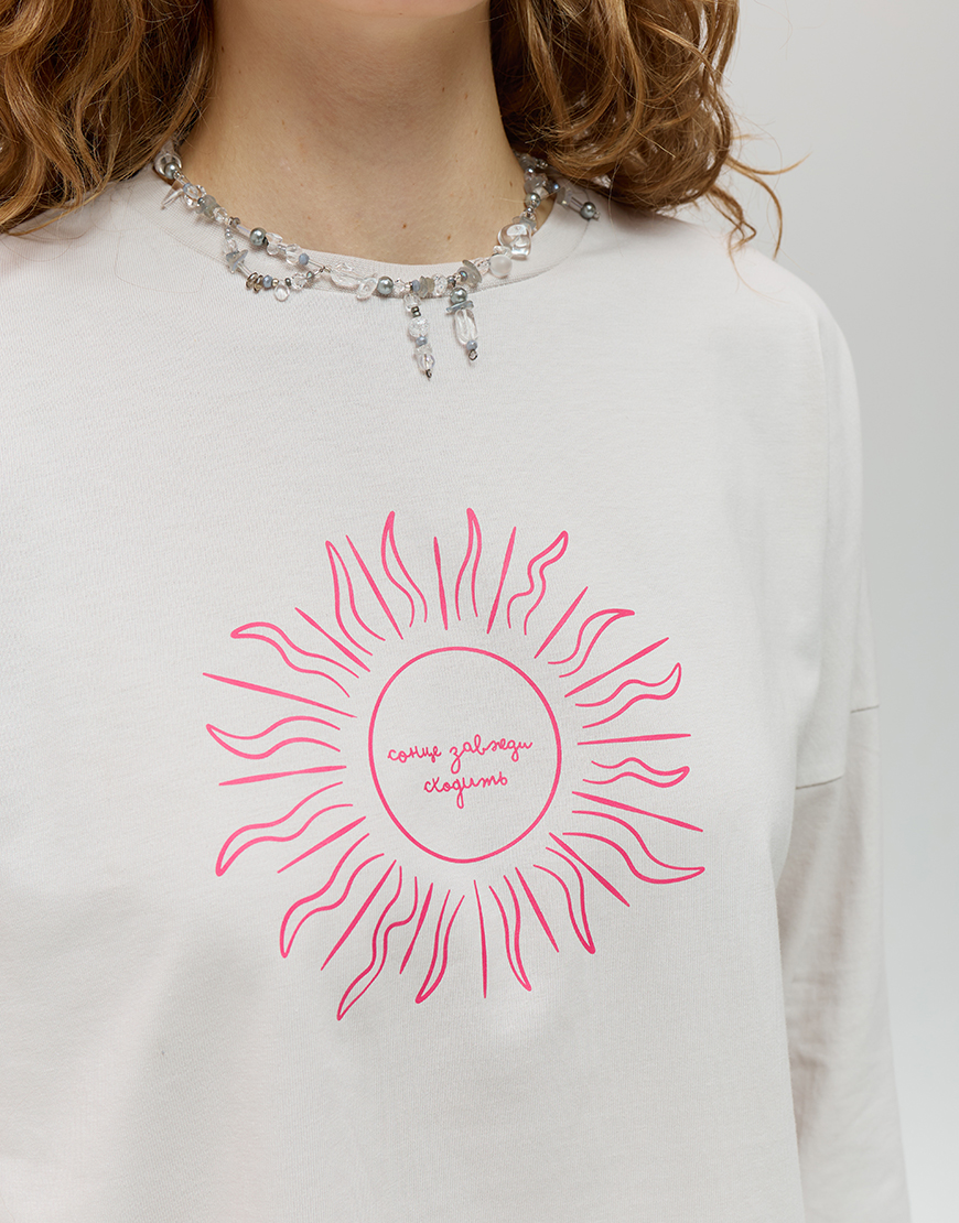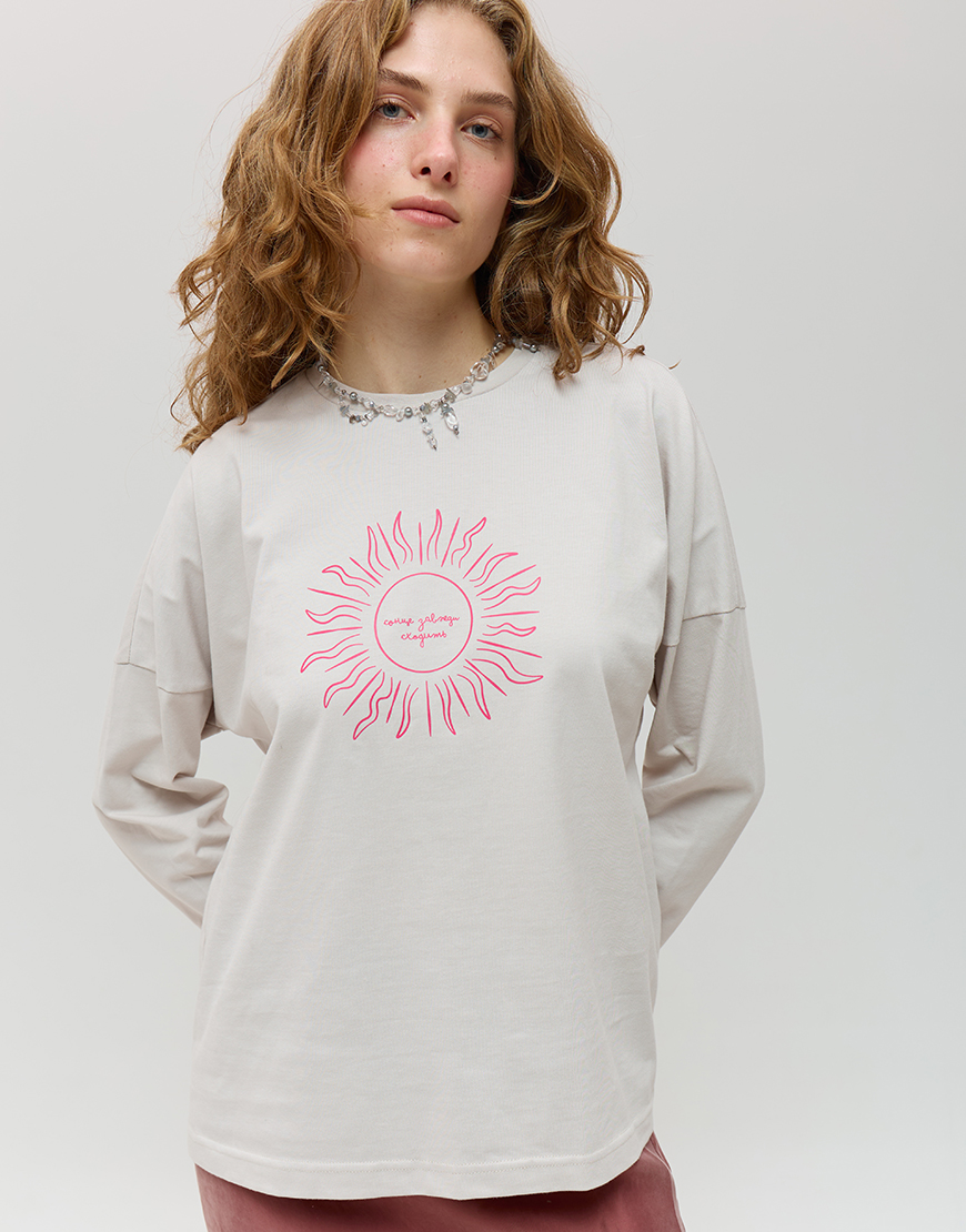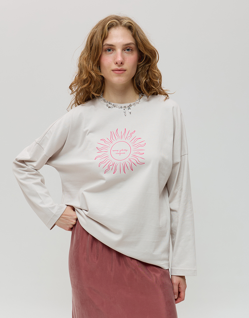 Доставка впродовж 2-5 робочих днівБавовняний лонгслів бежевого кольору з принтом: Сонце завжди сходить