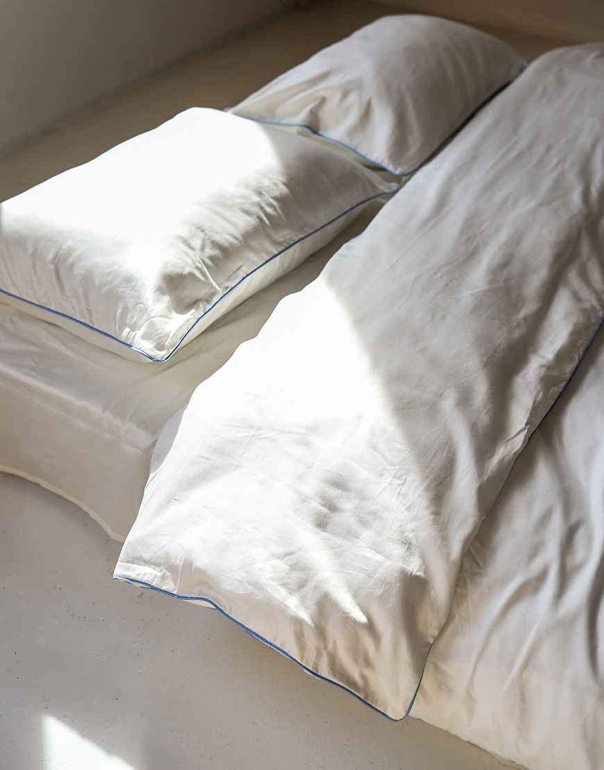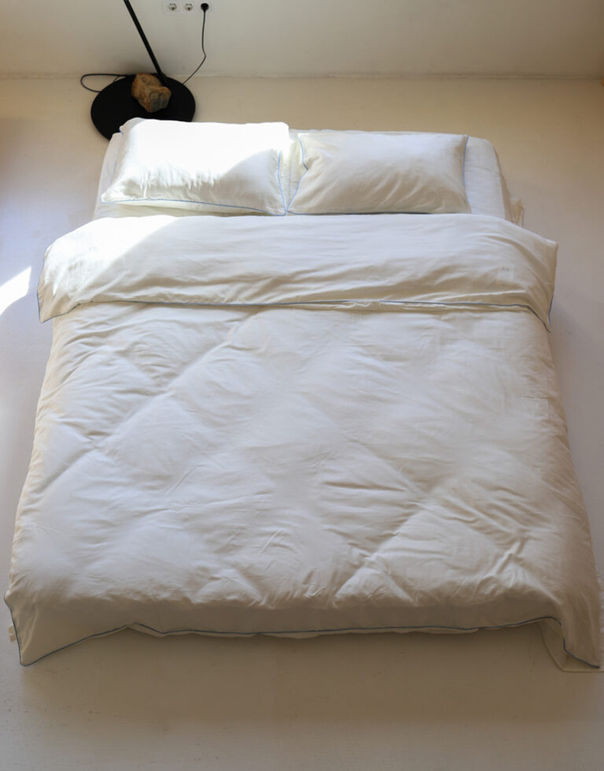 Комплект постільної білизни молочний сатин з блакитним кантом