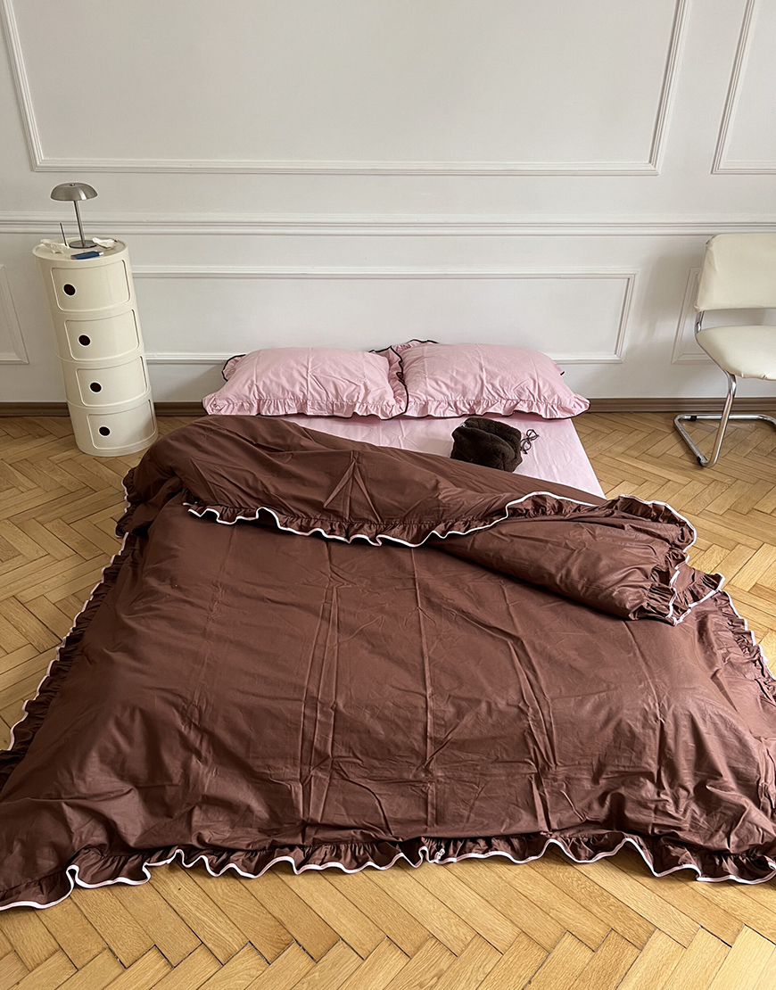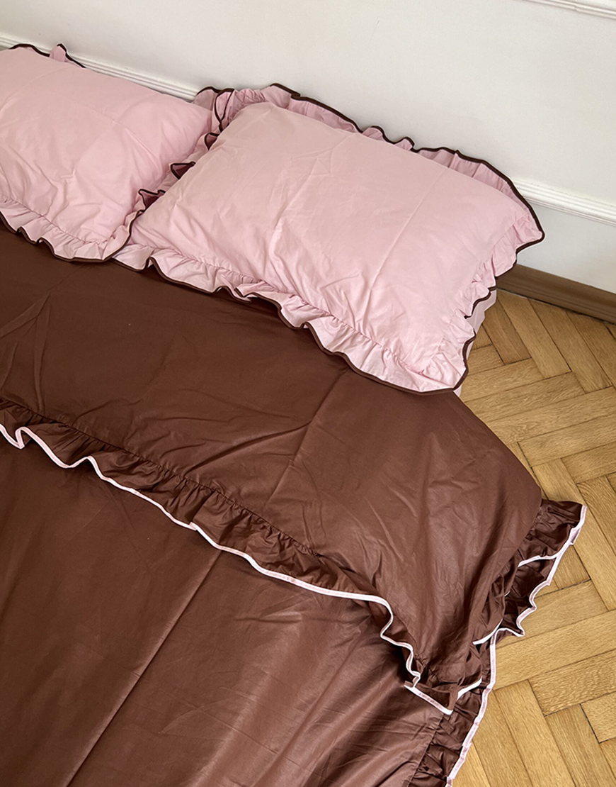 Комплект постільної білизни шоколадний ранфорс з рюшами та рожевим кантом