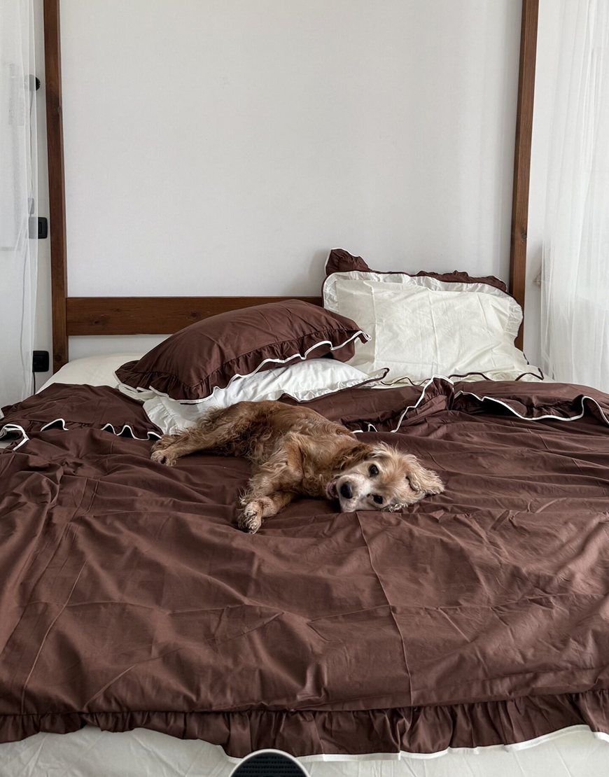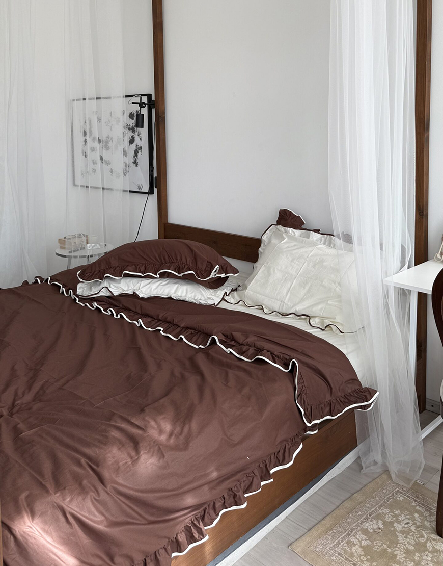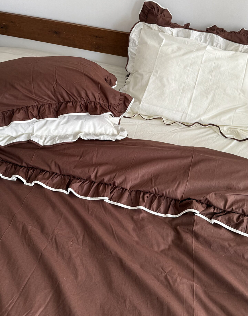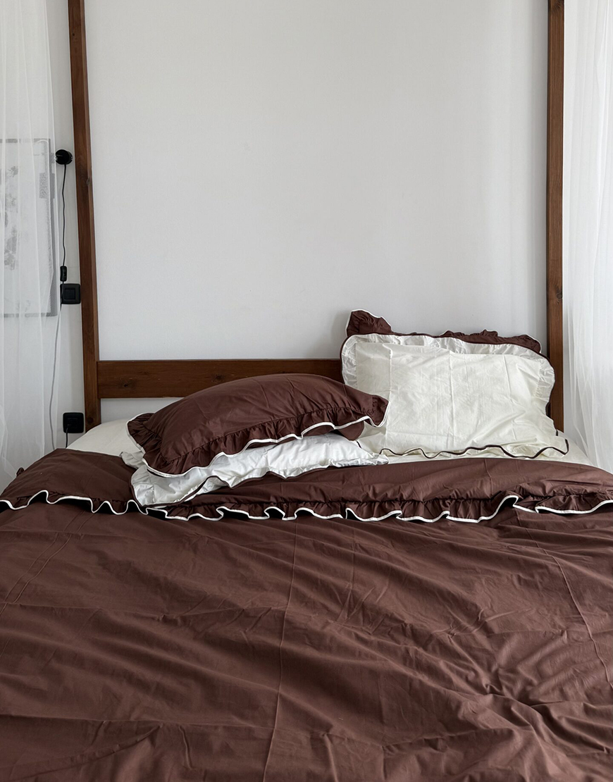 Комплект постільної білизни шоколадний ранфорс з рюшами та молочним кантом