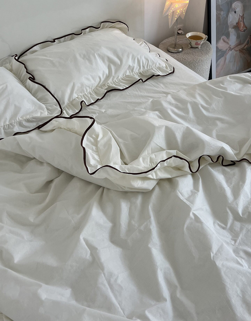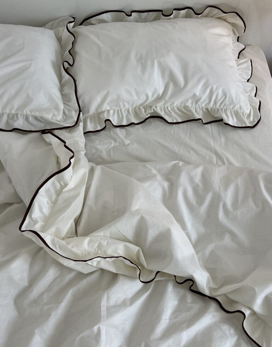 Комплект постільної білизни молочний ранфорс з рюшами та шоколадним кантом