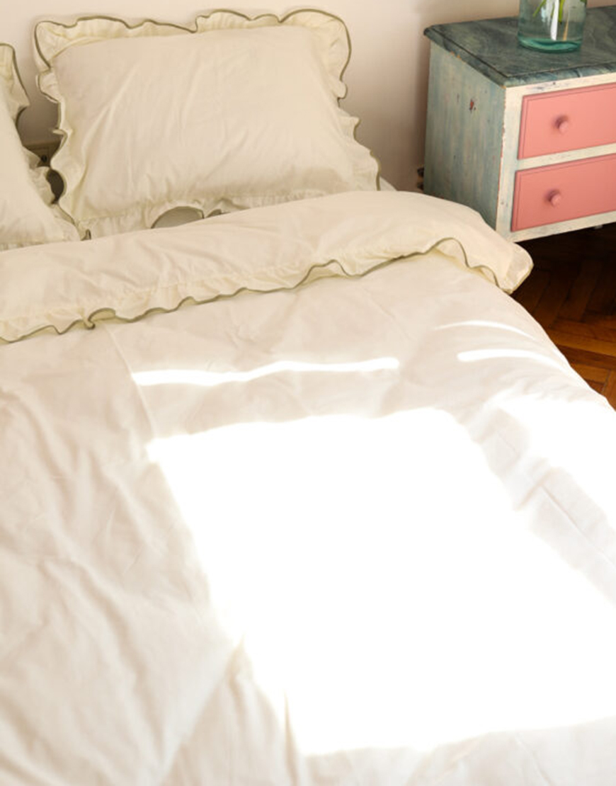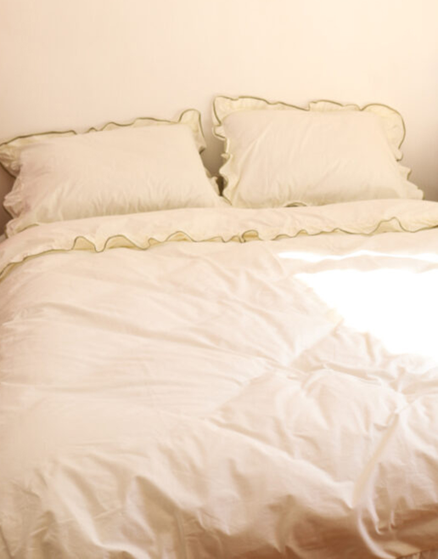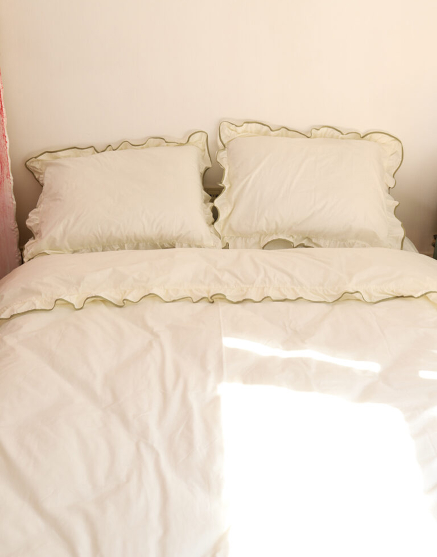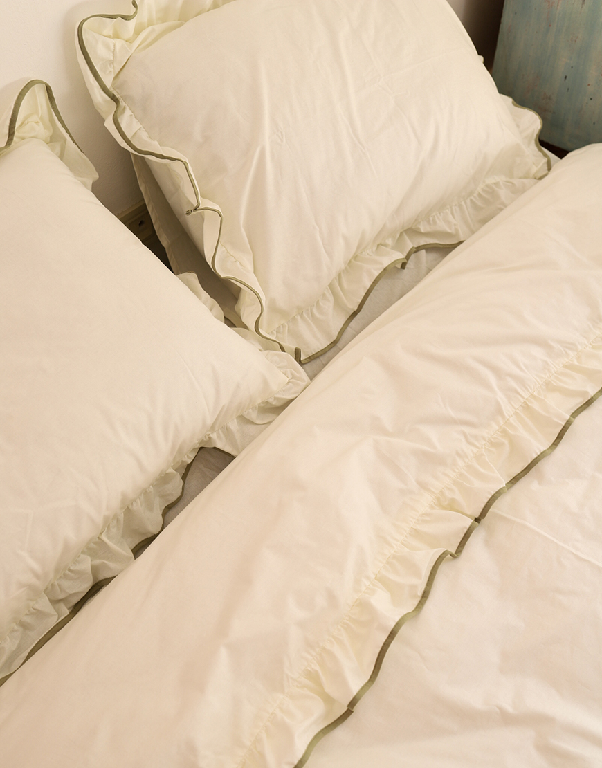 Комплект постільної білизни молочний ранфорс з рюшами та оливковим кантом