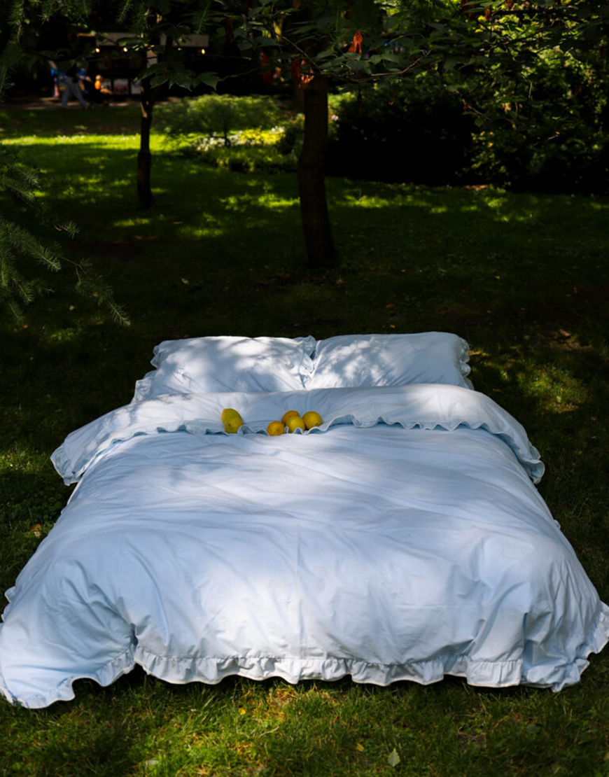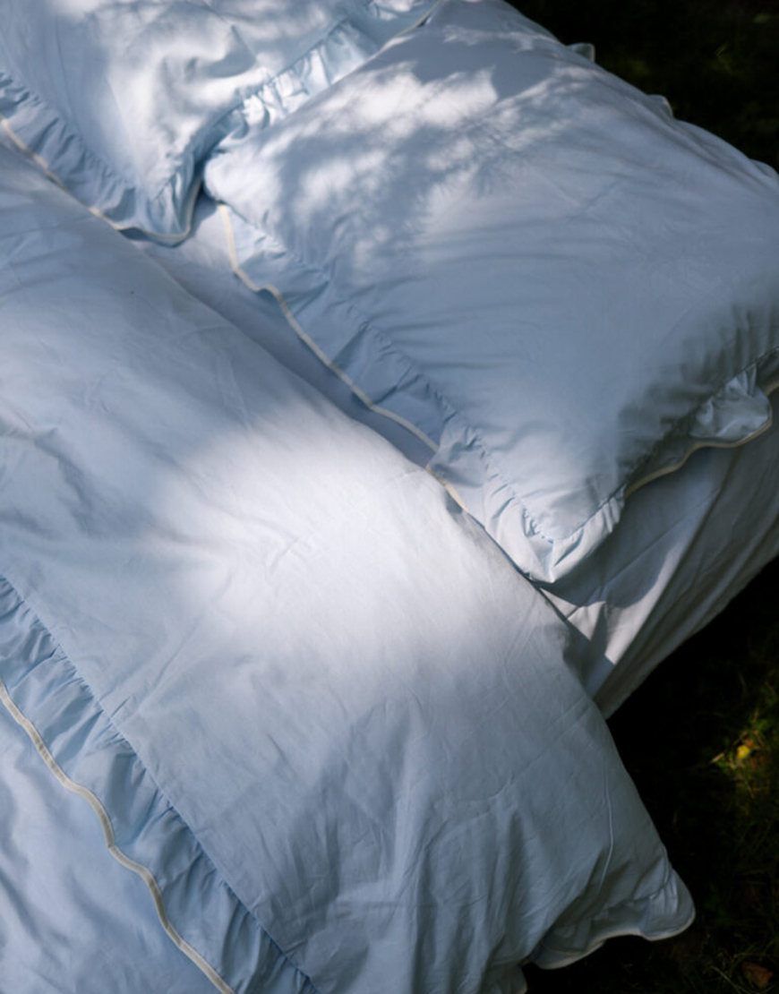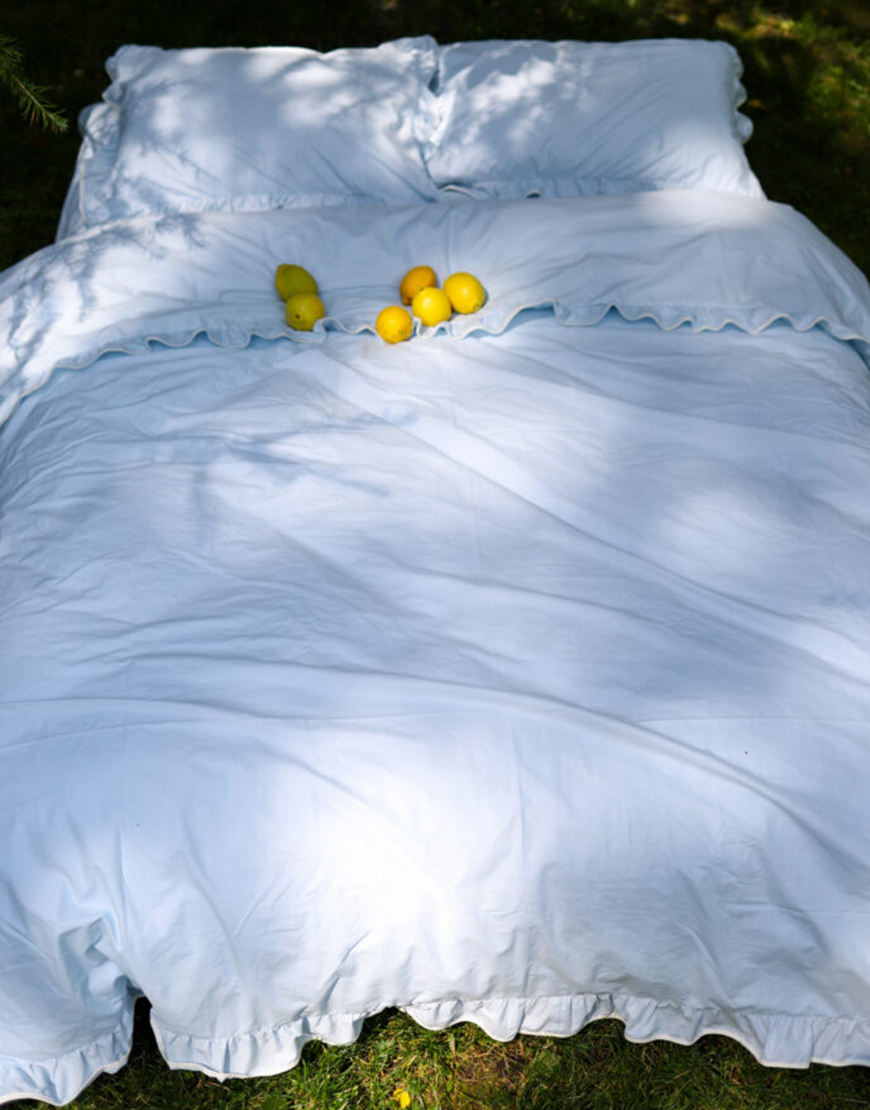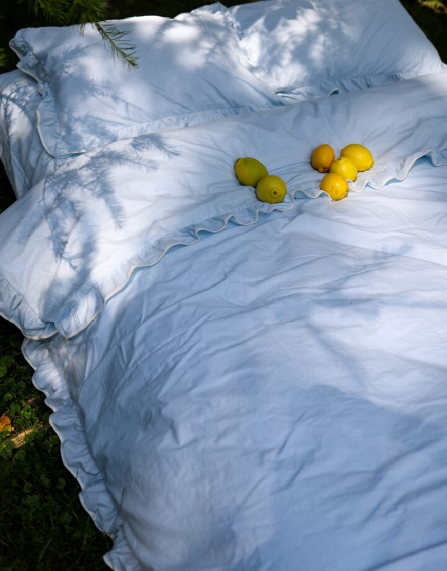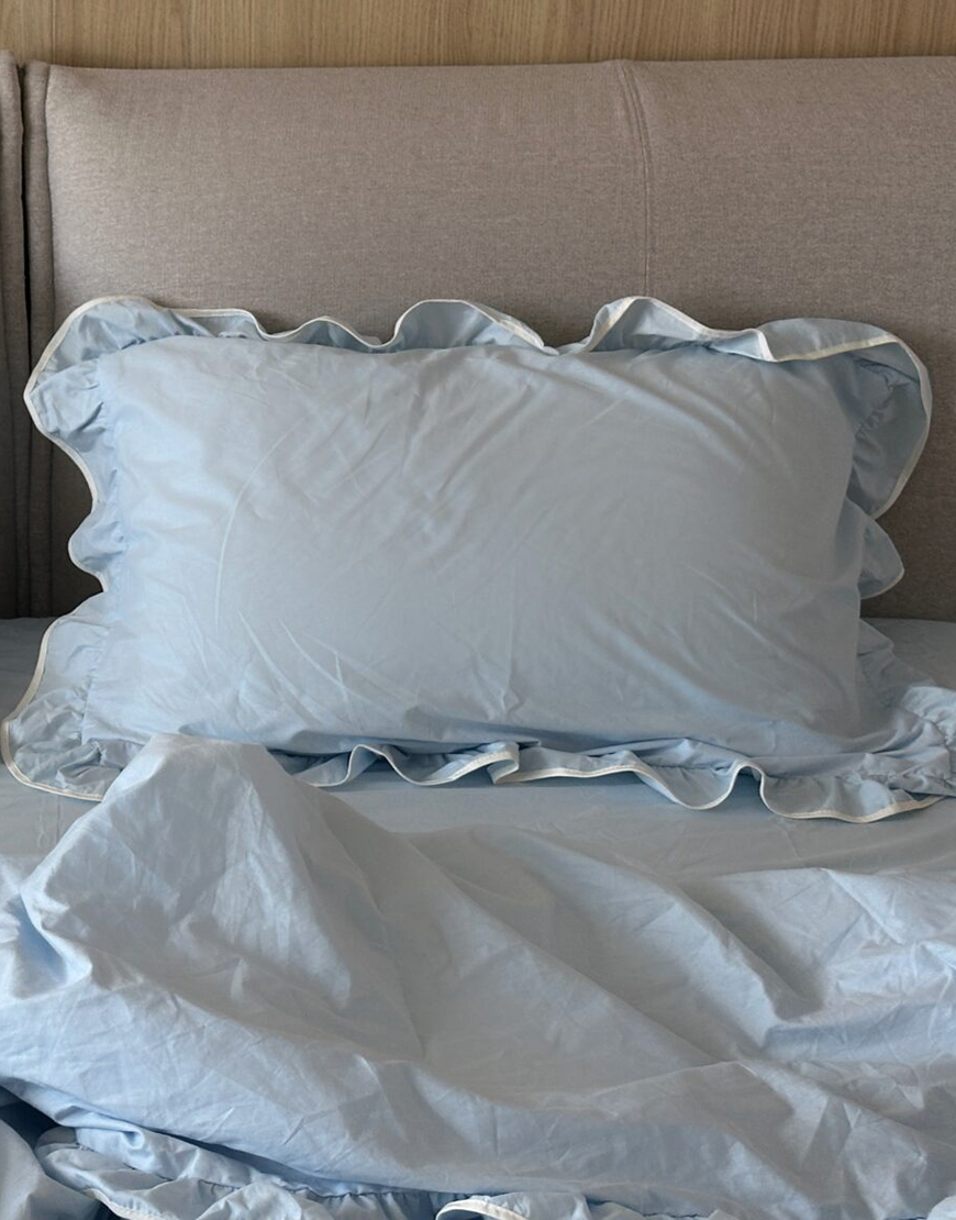 Комплект постільної білизни блакитний ранфорс з рюшами та молочним кантом