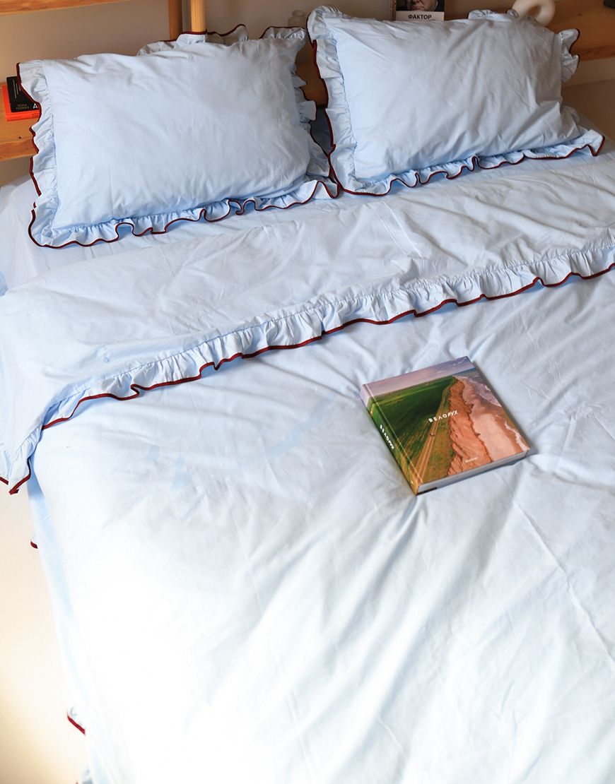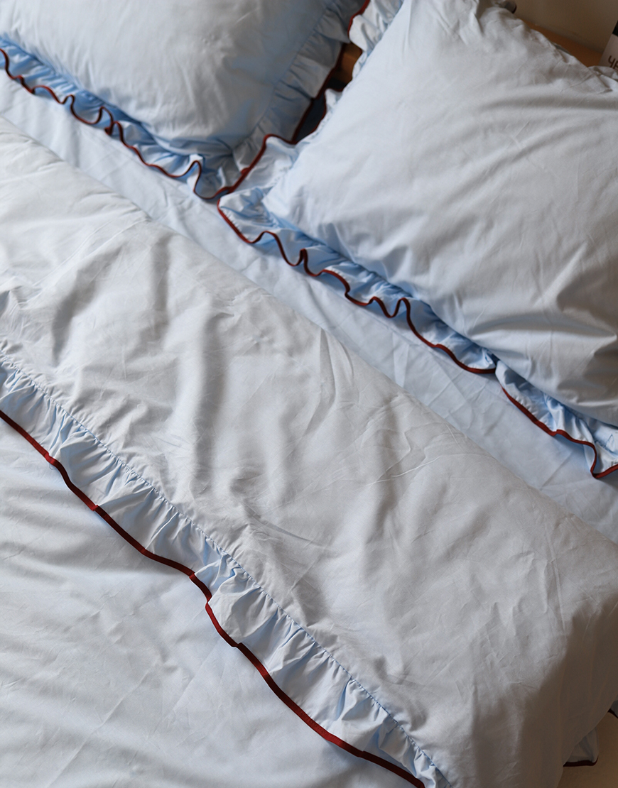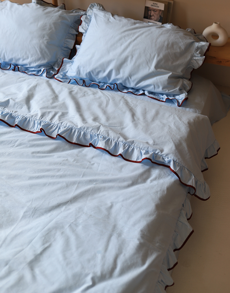 Комплект постільної білизни блакитний ранфорс з роюшами та бордовим кантом