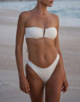 Роздільний купальник Milara – класична базова модель купальника, що складається з топу-бандо на зав’язку та напівзакритими позаду плавками середньої посадки. Модель підкреслює силует талії та візуально видовжує ноги. Виконаний із подвійною підкладкою, з декоративним вертикальним вирізом та золотою фурнітурою по центру бюста. В комплекті з купальником пара бретелей.