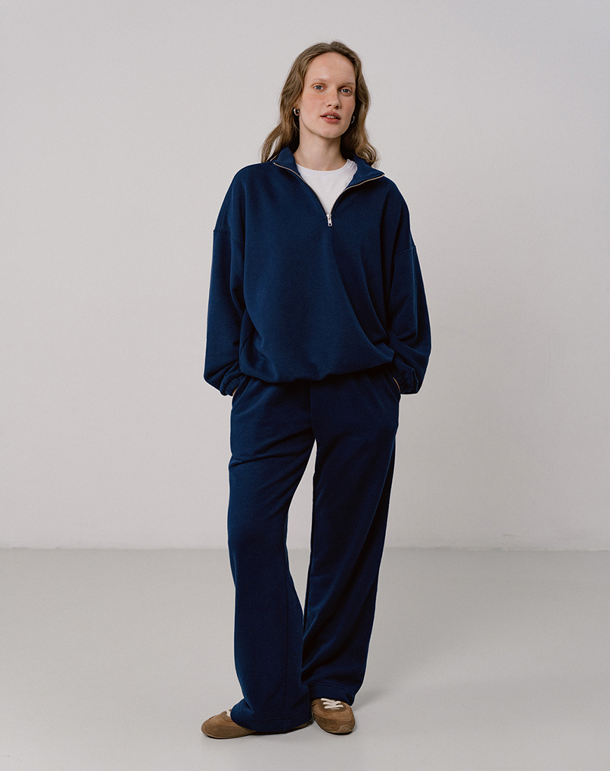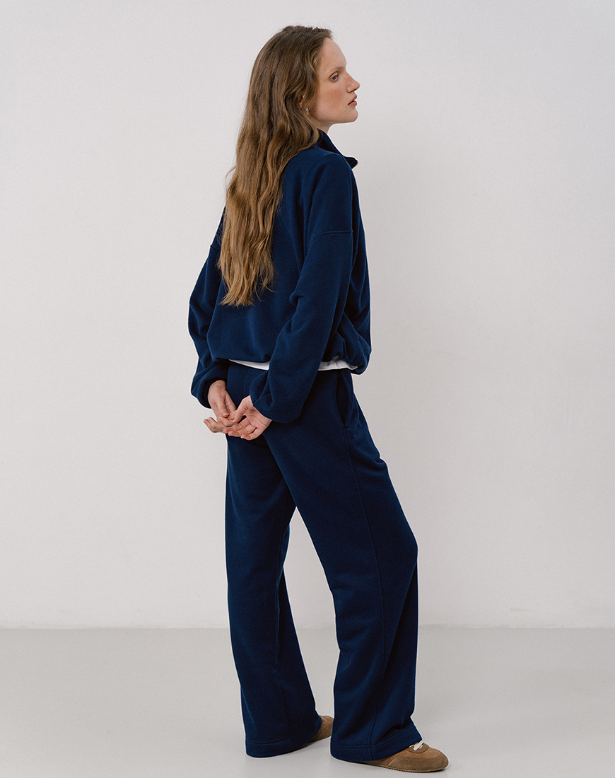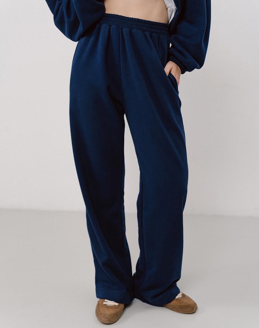 Доставка впродовж 2-5 робочих днівПрямі штани темно-синього кольору. Трикотаж середньої щільності, петля зсередини (не утеплені). Обробка soft touch – надзвичайно м’які на дотик. Висока посадка, пояс на резинці. Штани повномірні.