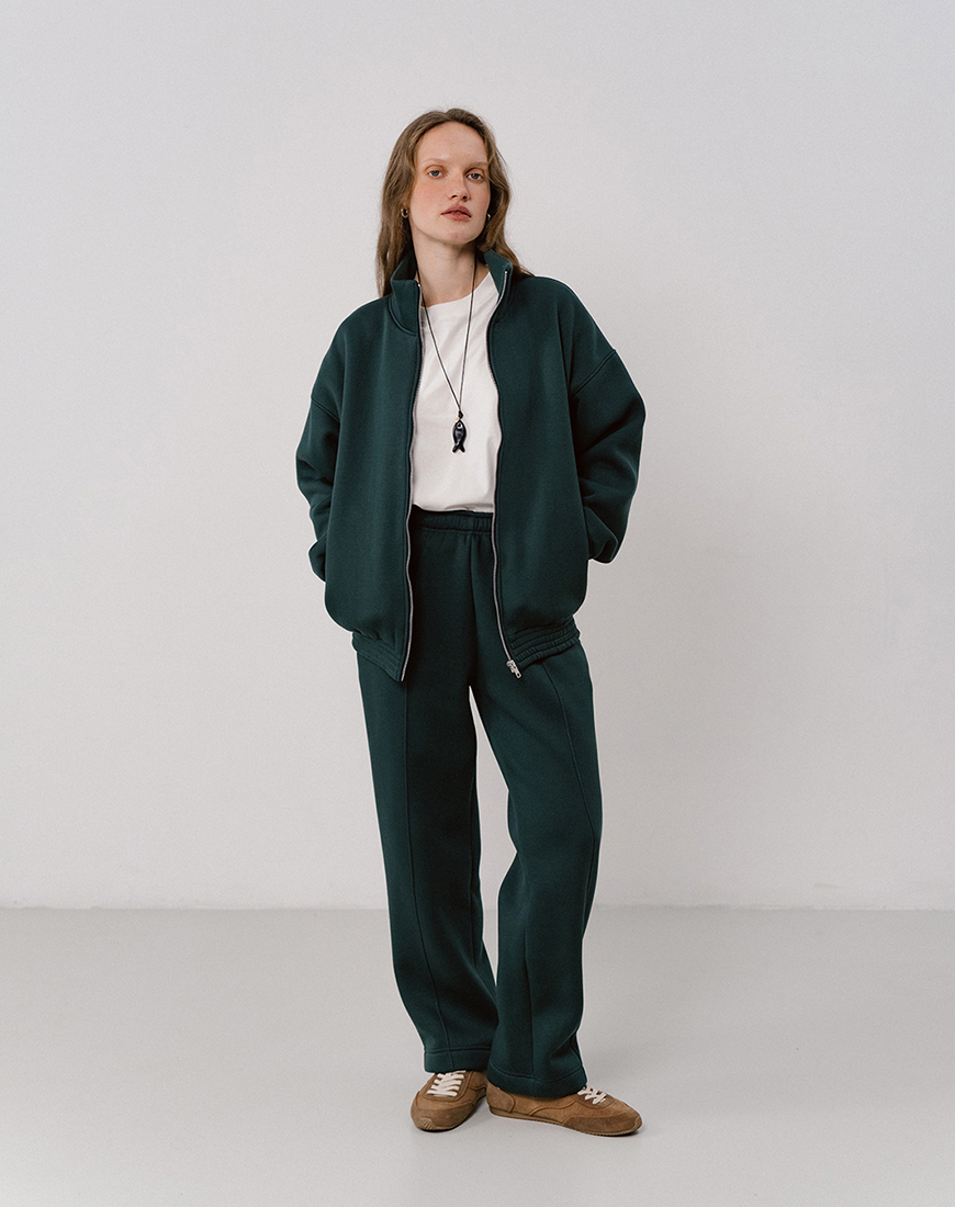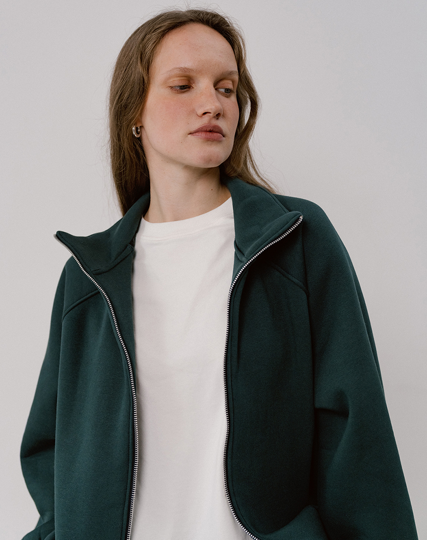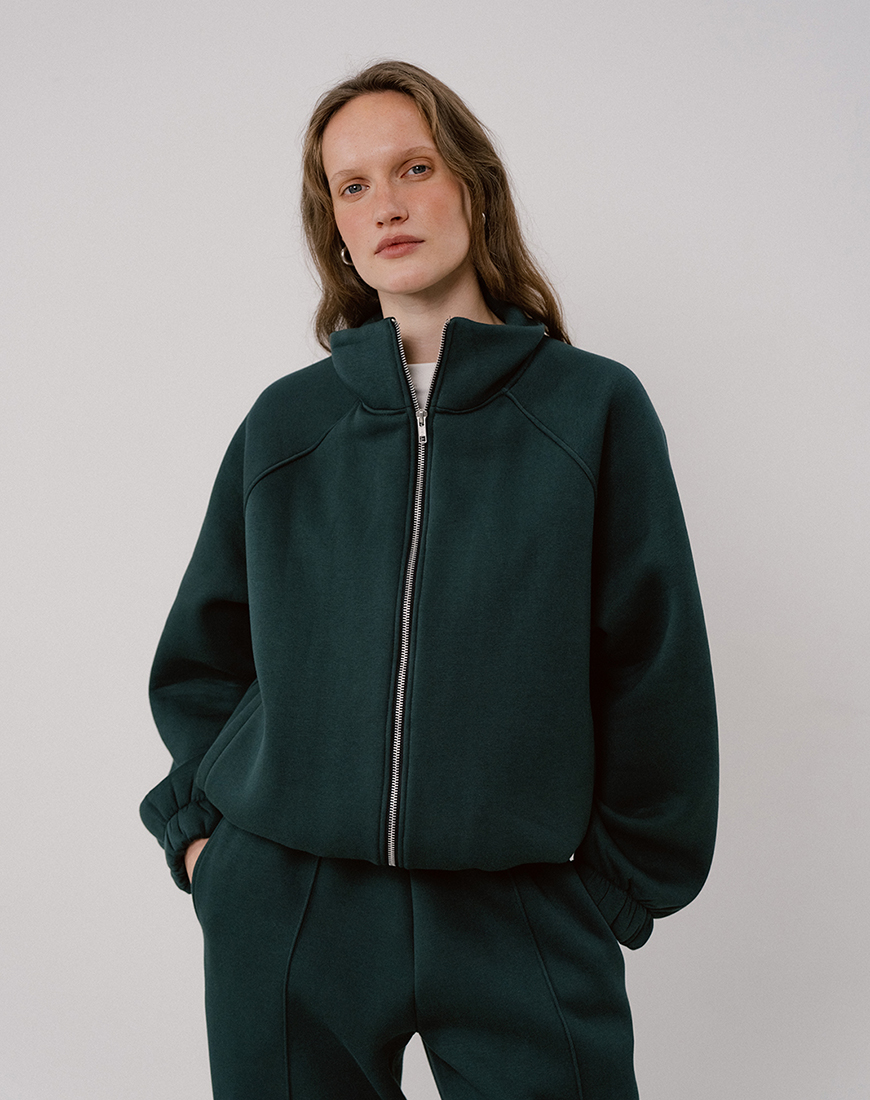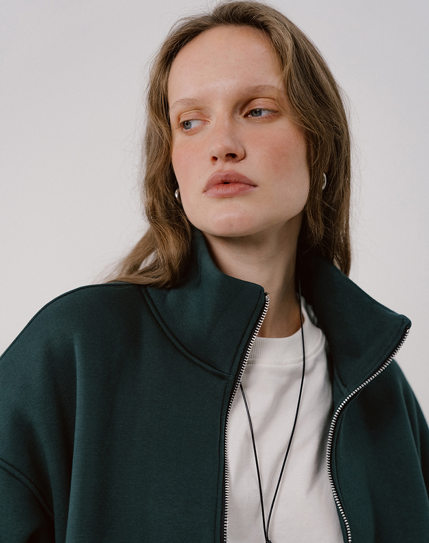 Доставка впродовж 2-5 робочих днівУтеплений світшот на натуральній підкладці темно-зеленого кольору. Низ та рукави на резинці з декоративними строчками. На блискавці, по боках кишені.