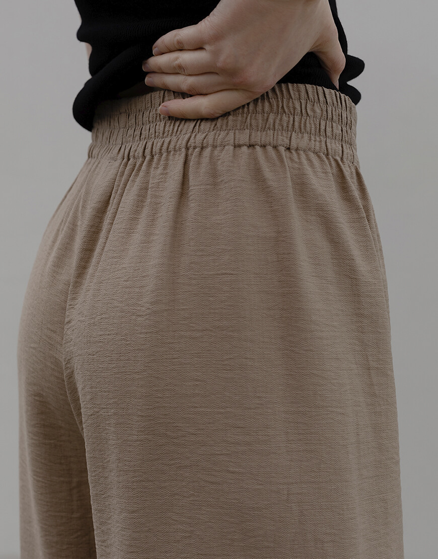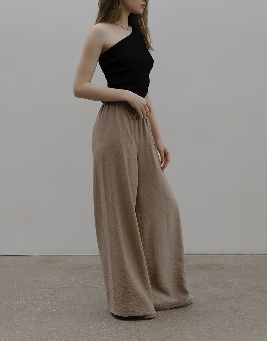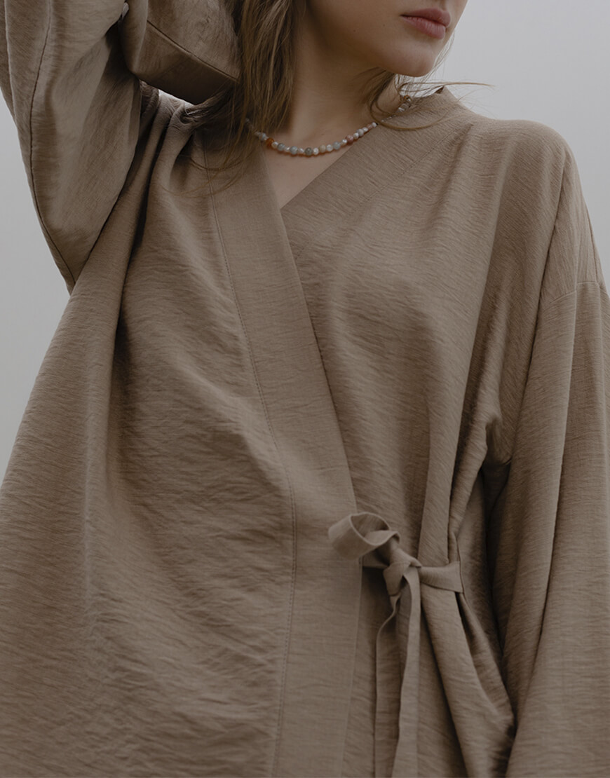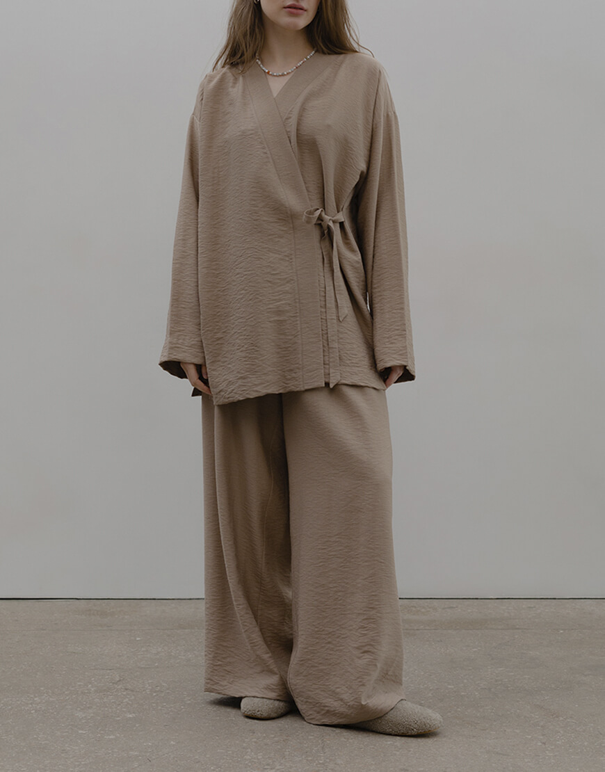 Набір кольору “кава з молоком” з тканини з ефектом жатка. Тканина м’яка та легка, що не потребує прасування. Не просвічується. Кімоно спереду на зав’язці. Штани широкі, висока посадка. При машинному пранні виріб може дати усадку на 1-2 см по довжині