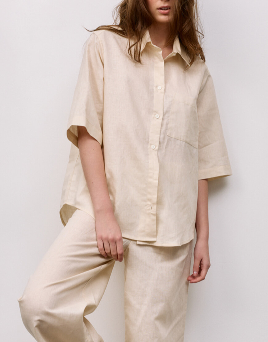 2 500 грнСорочка з натурального льону преміум якості у відтінку крем-брюле. Вкрочені рукави по лікоть. Модель оверсайз. Розмір one size підходить на параметри від S до L.