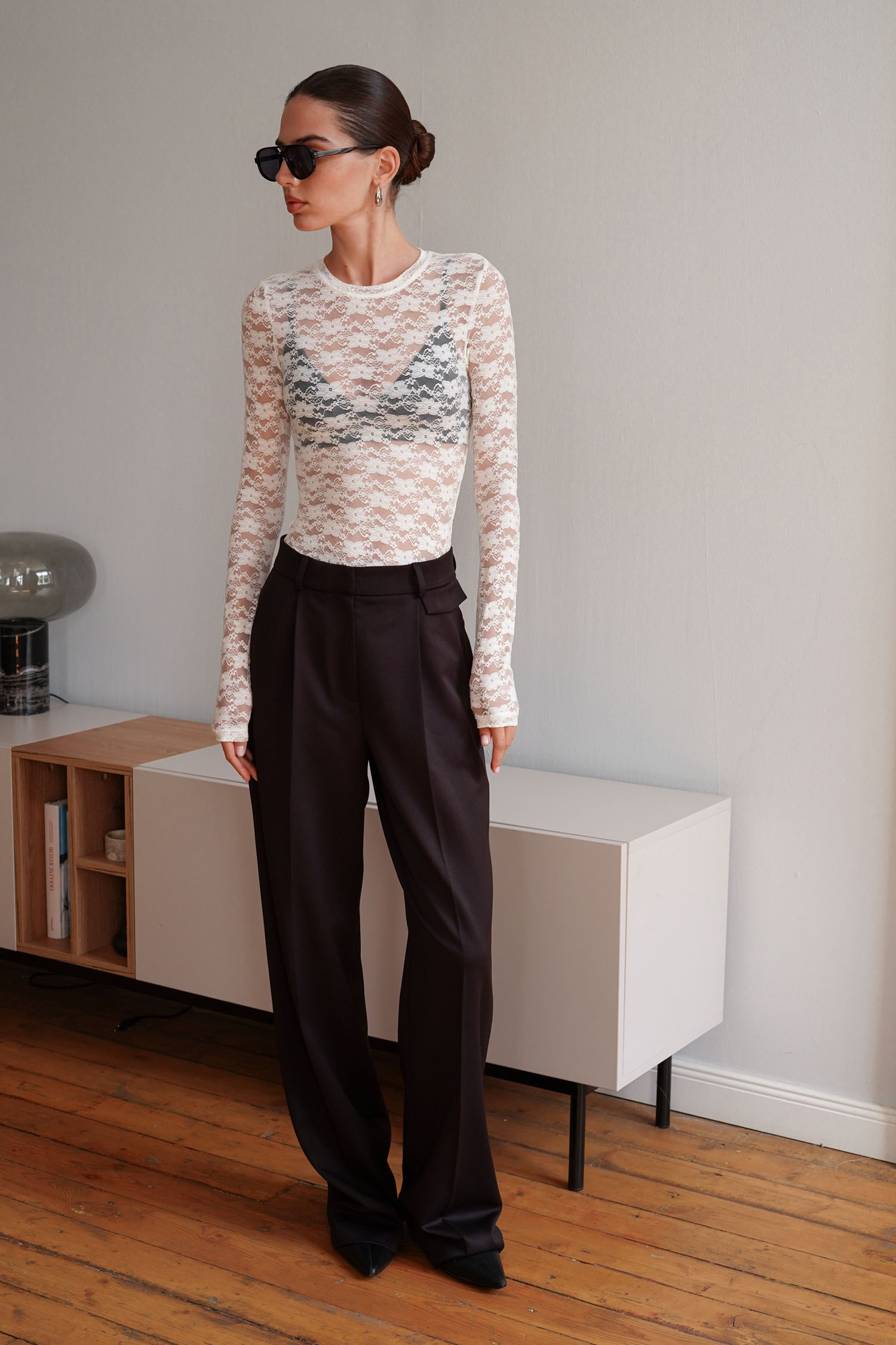 Шоколадні брюки палаццо, оздоблені декоративним клапаном. Прямий крій і висока посадка візуально подовжують силует. Виконані зі щільної костюмної тканини, яка надійно тримає форму. Комфортна посадка та чітка лінія крою роблять їх базовою річчю для стильних образів.