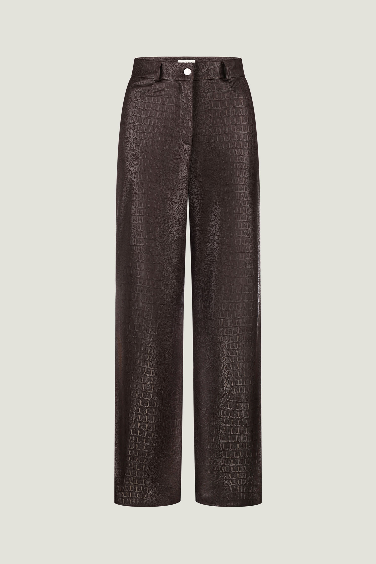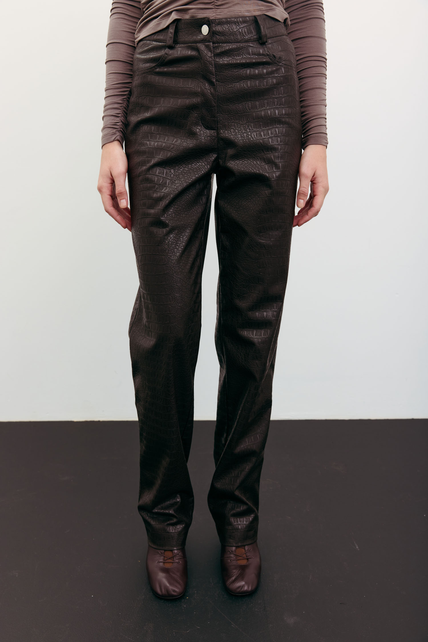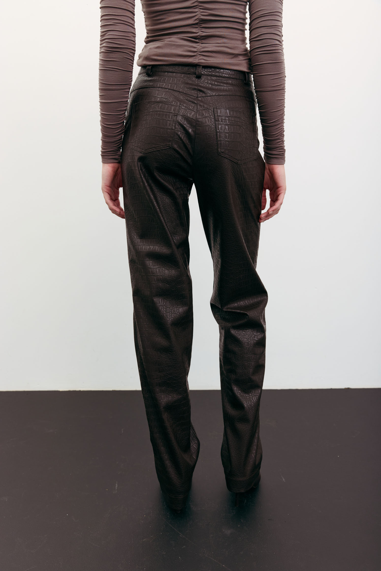 Брюки прямі з фактурної еко-шкіри шоколадні