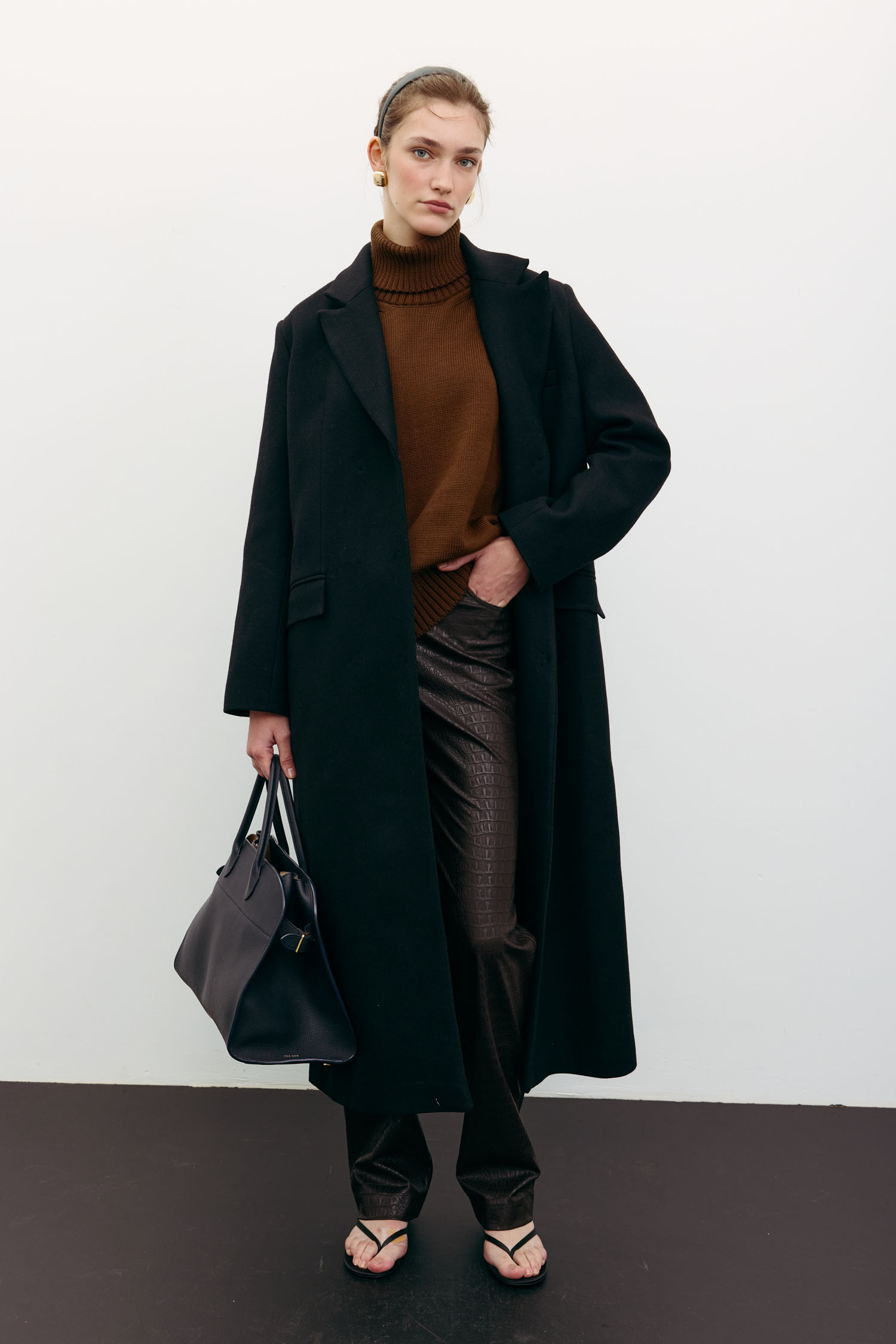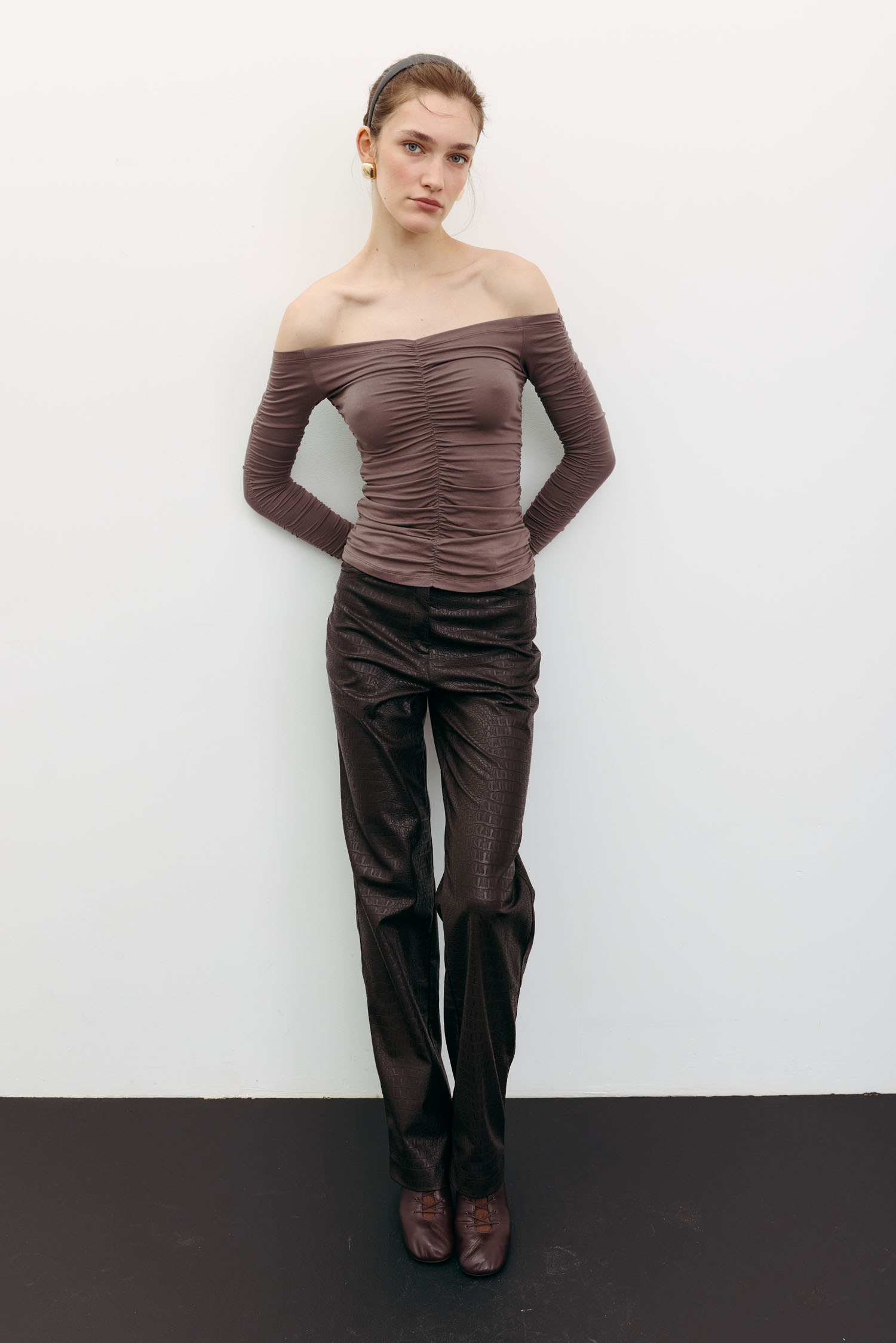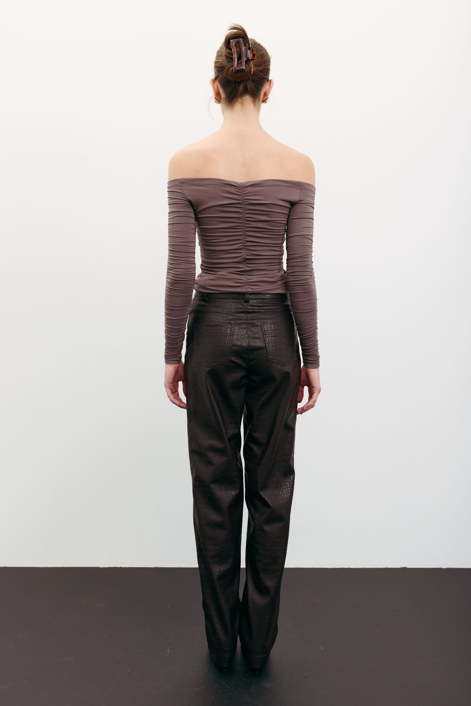 Брюки прямі з фактурної еко-шкіри шоколадні