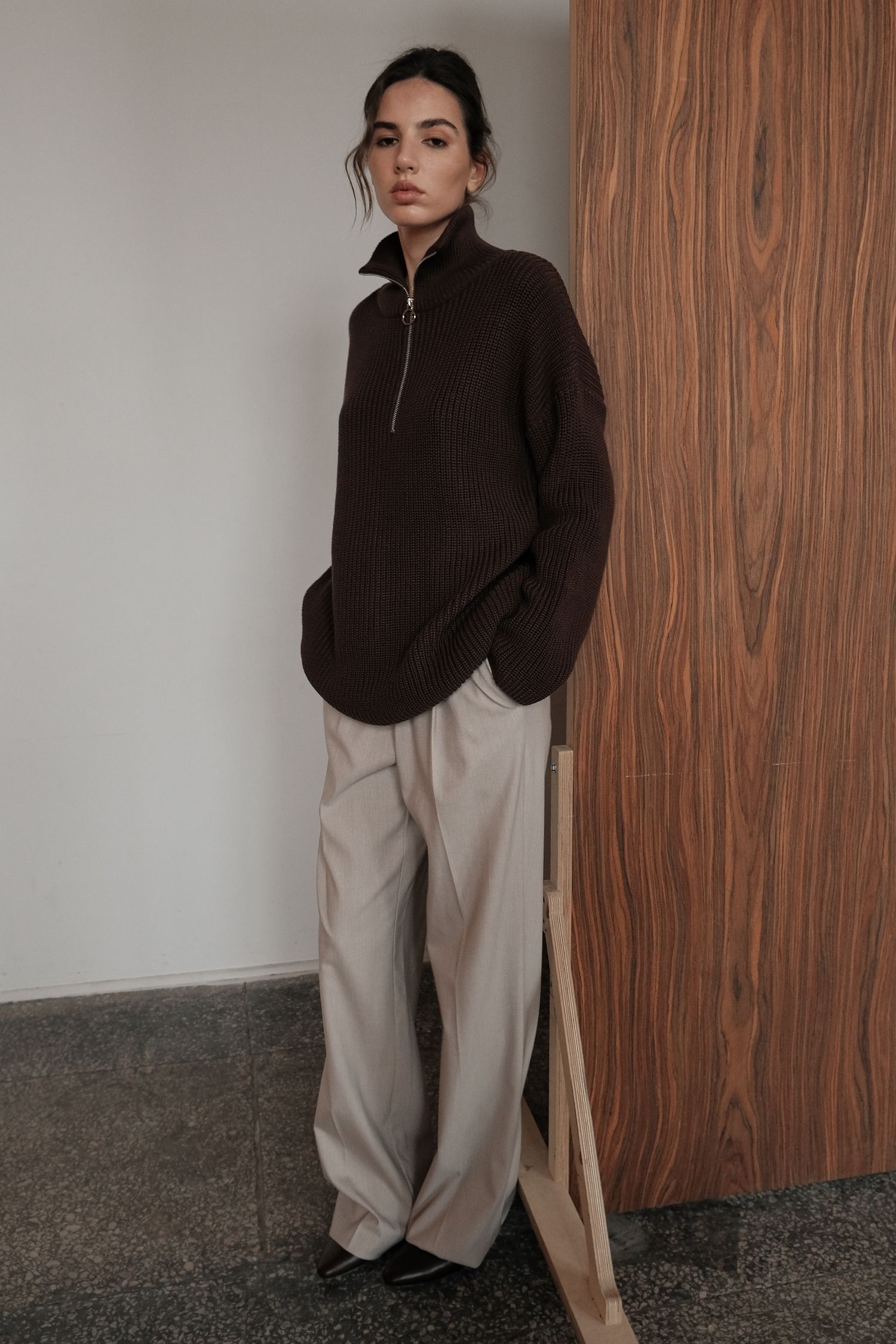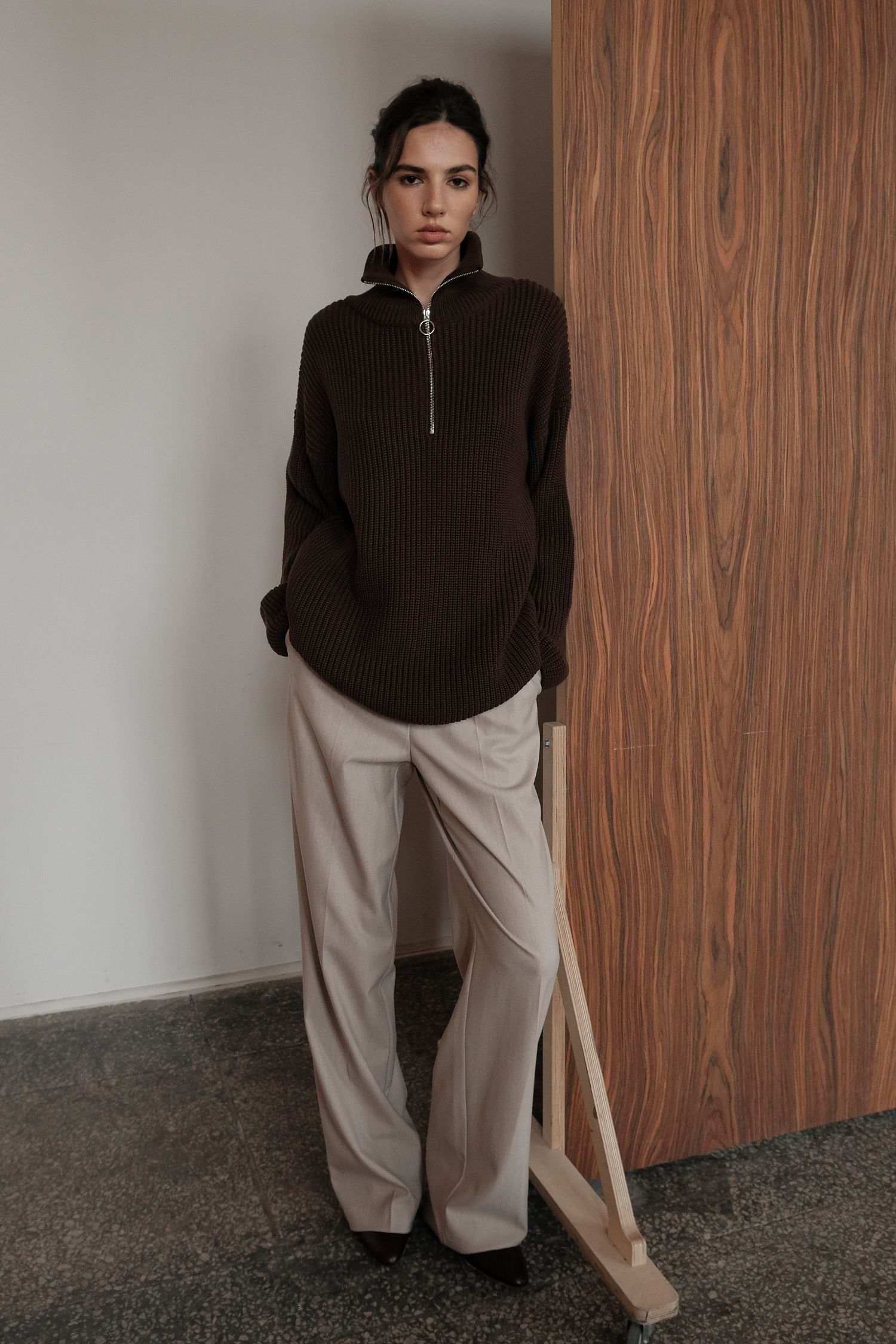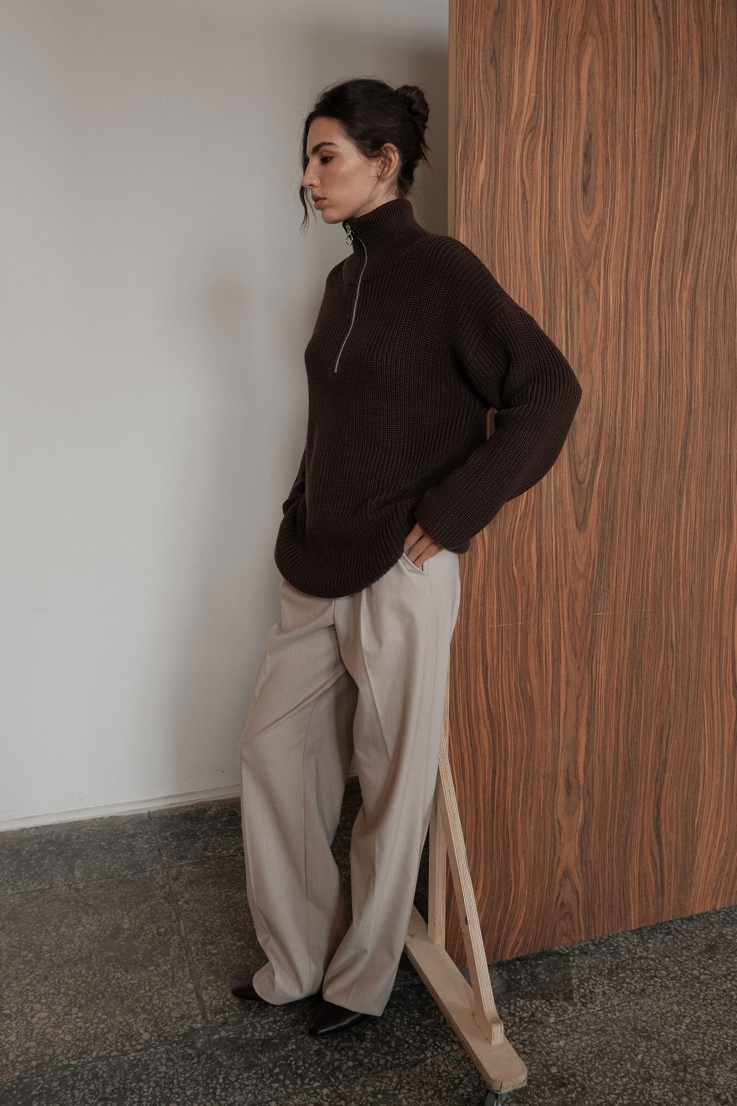 ДоставкаБрюки палаццо світло-бежевого відтінку. Класичний крій із високою посадкою, защипами та практичними бічними кишенями. Зроблені зі щільної костюмної тканини з вовняним складником.