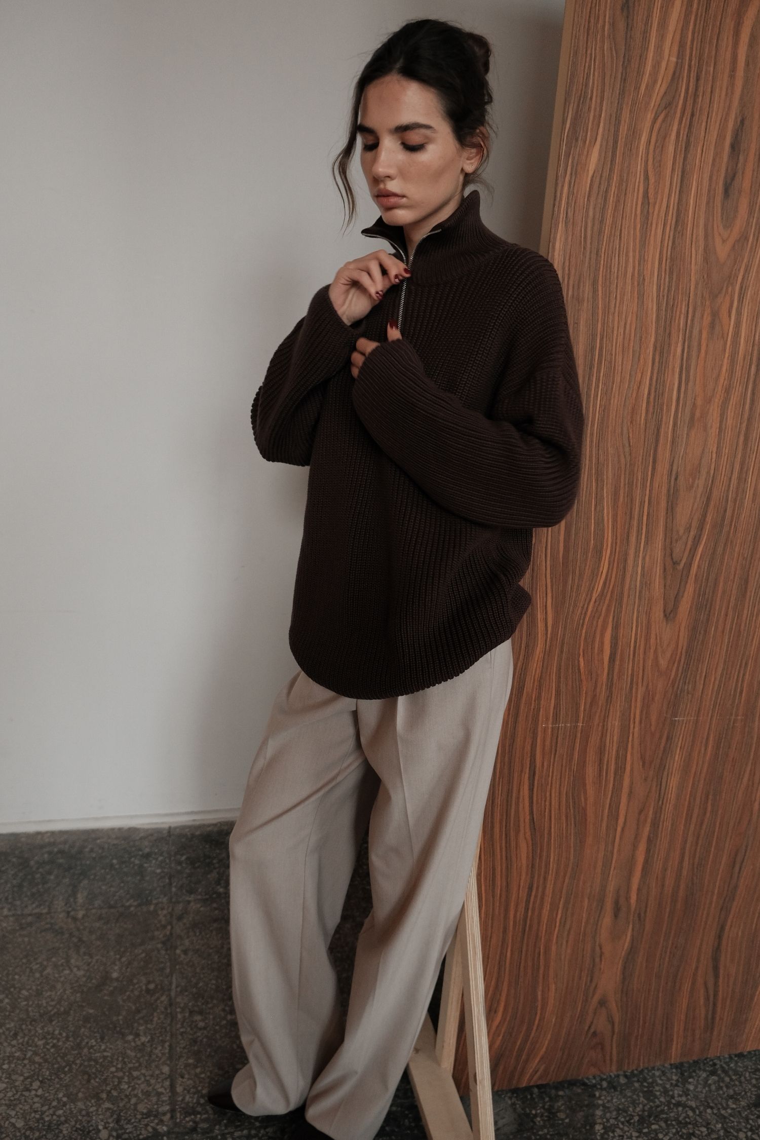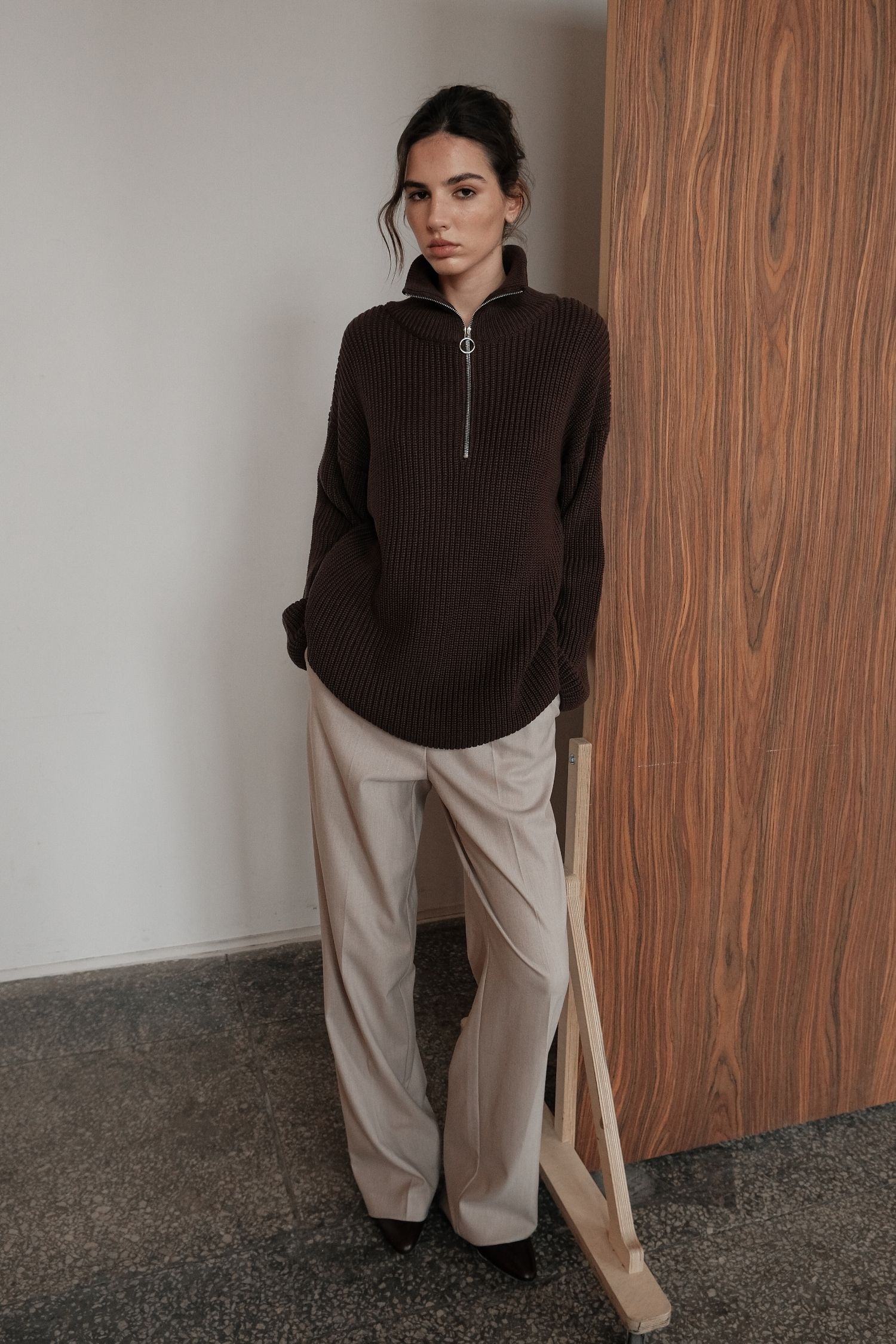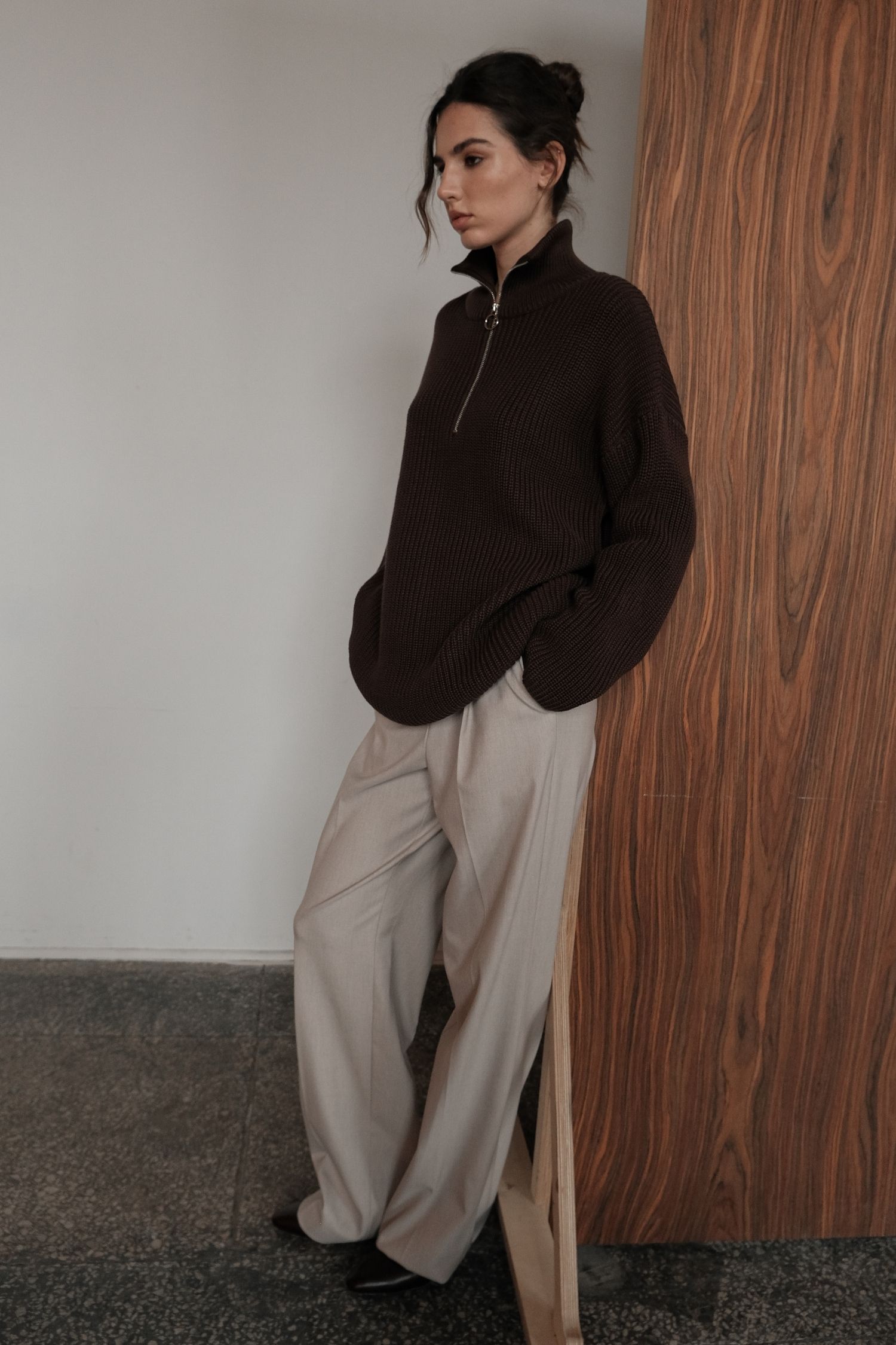 ДоставкаБрюки палаццо світло-бежевого відтінку. Класичний крій із високою посадкою, защипами та практичними бічними кишенями. Зроблені зі щільної костюмної тканини з вовняним складником.