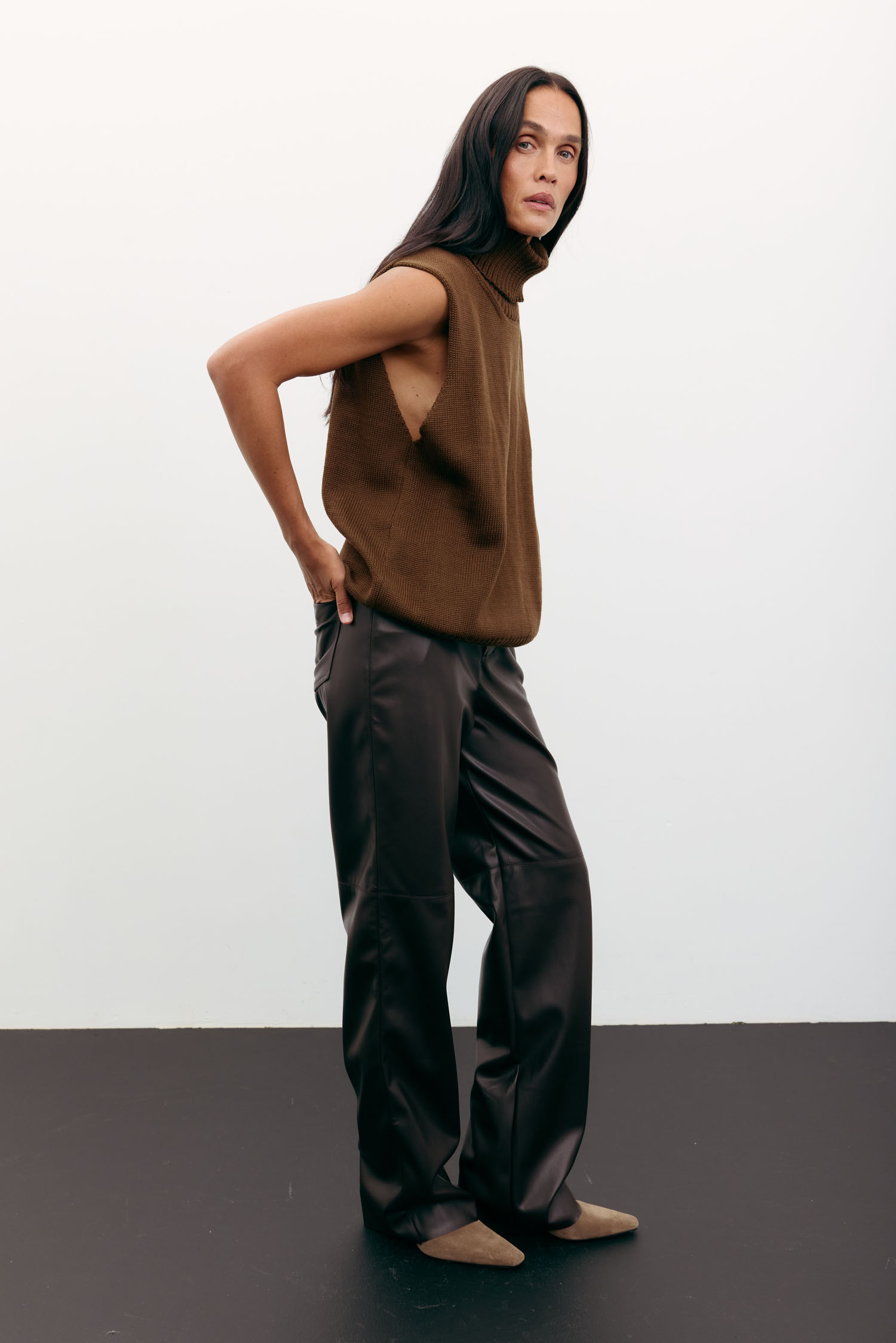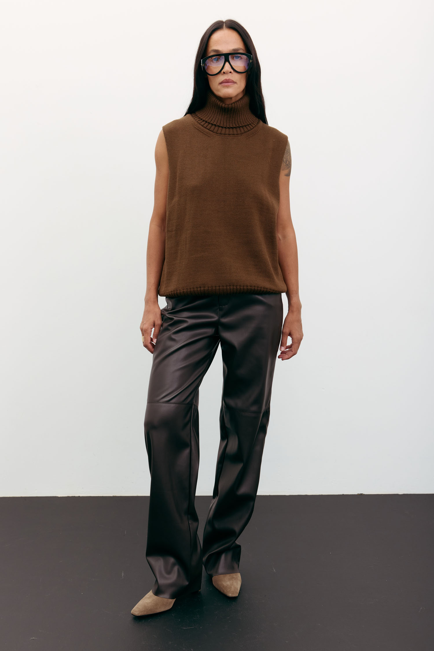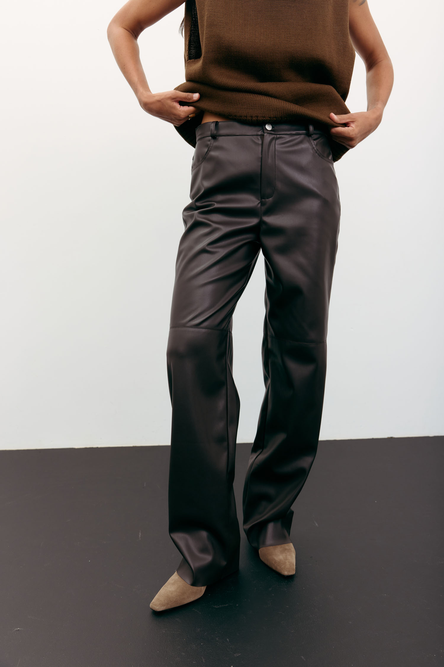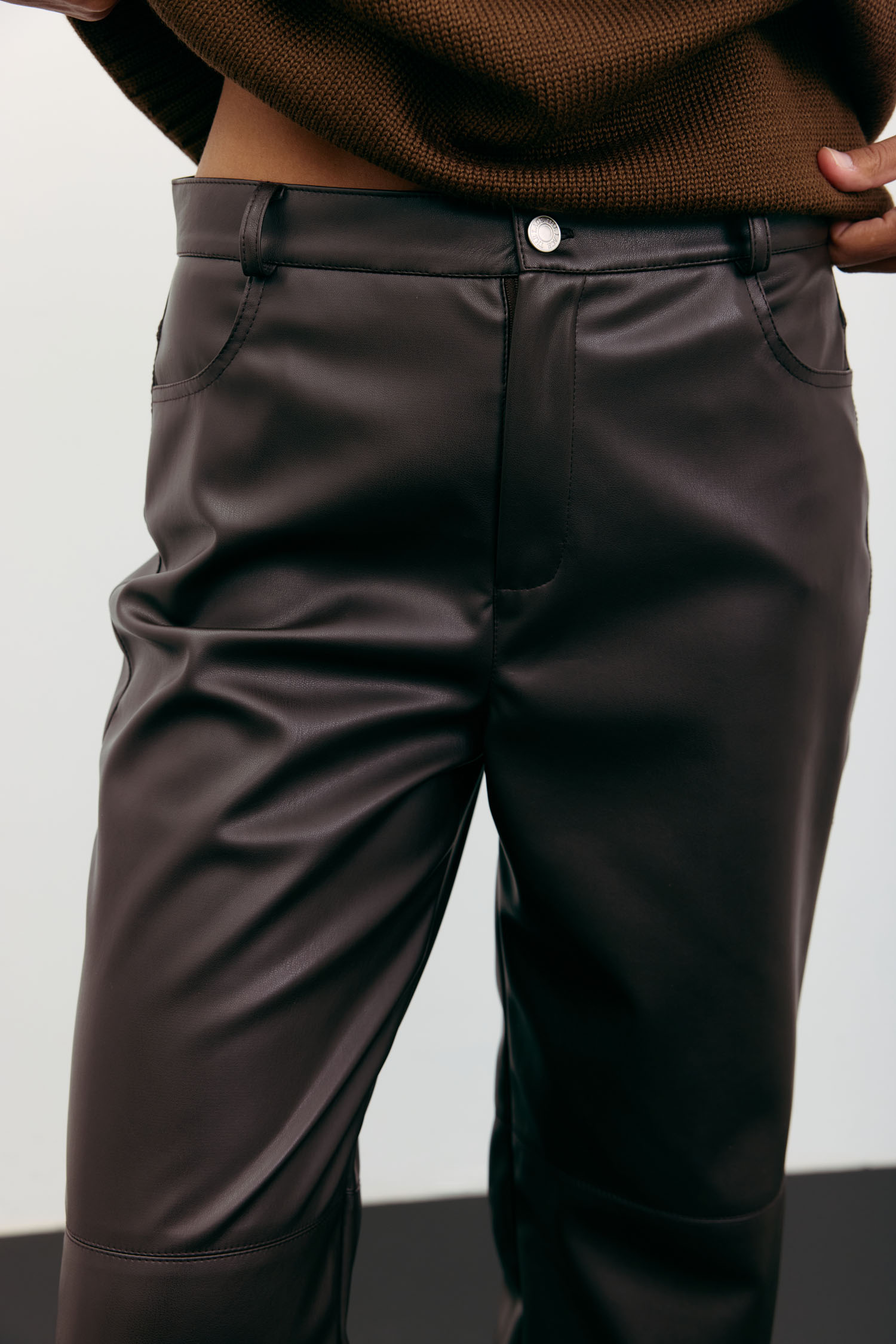 ДоставкаБрюки з екошкіри насиченого шоколадного відтінку. Прямий крій і середня посадка. Призначені для осінньо-зимового сезону. Оснащені бічними та задніми кишенями. Добре поєднуються з м’яким трикотажем, теплою вовною, сорочками й топами.