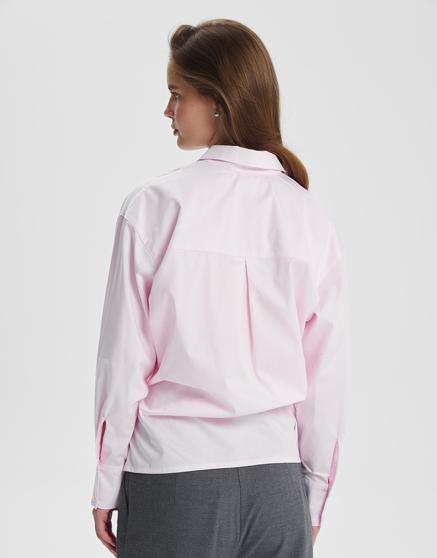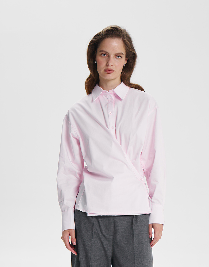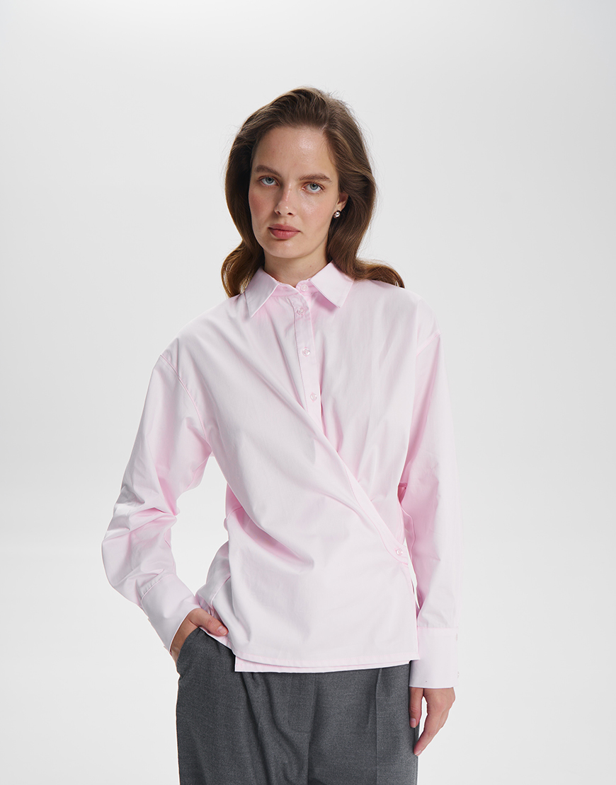 Доставка протягом 2-5 робочих днівБавовняна сорочка асиметричного крою, яка грає формою і рухом тканини. Ніжний пастельний відтінок створює відчуття спокою, немов ранковий дощ стирає контури міста. Ідеальна для того, щоб додати образу несподіваних ліній, не порушуючи загальної стриманості силуету