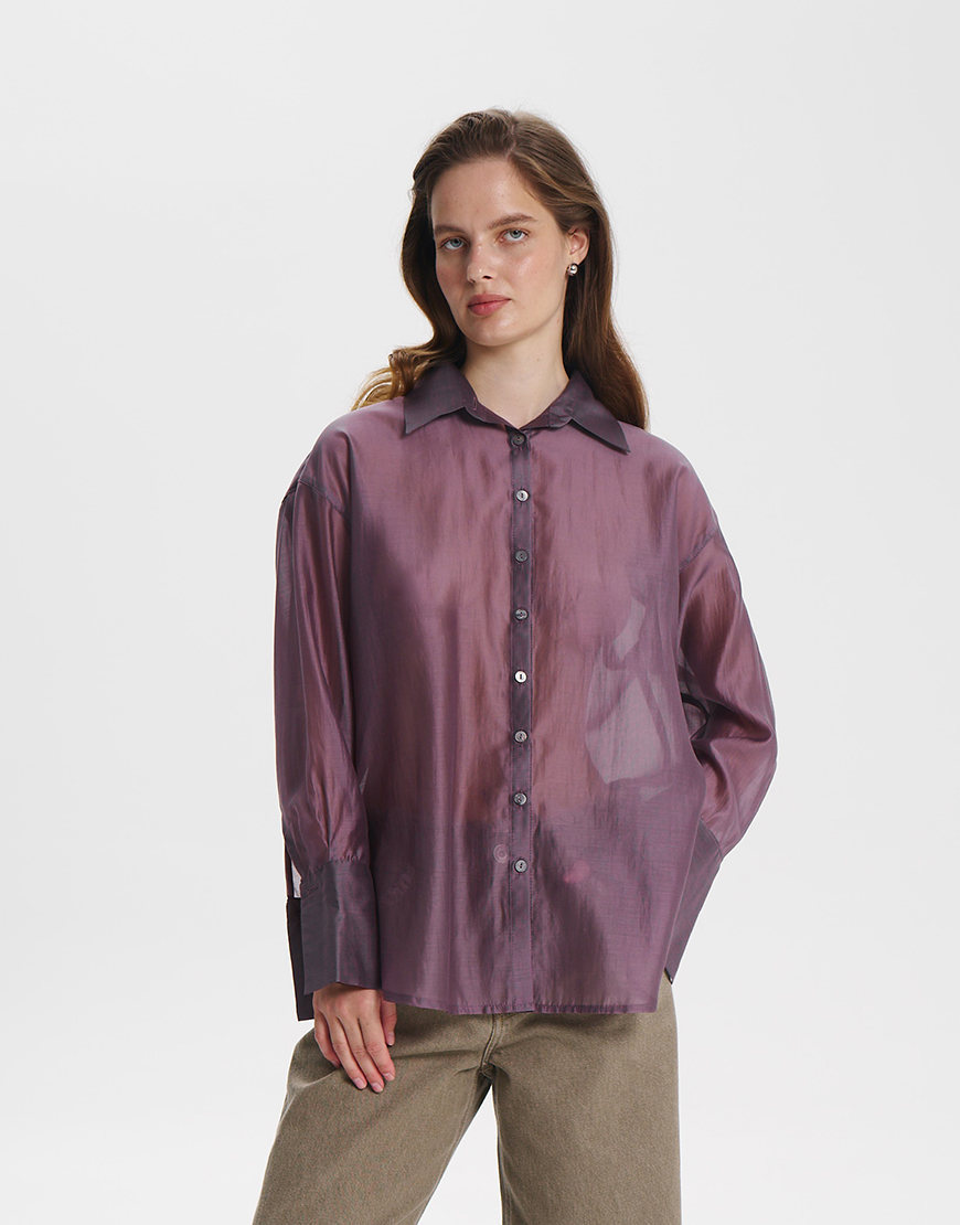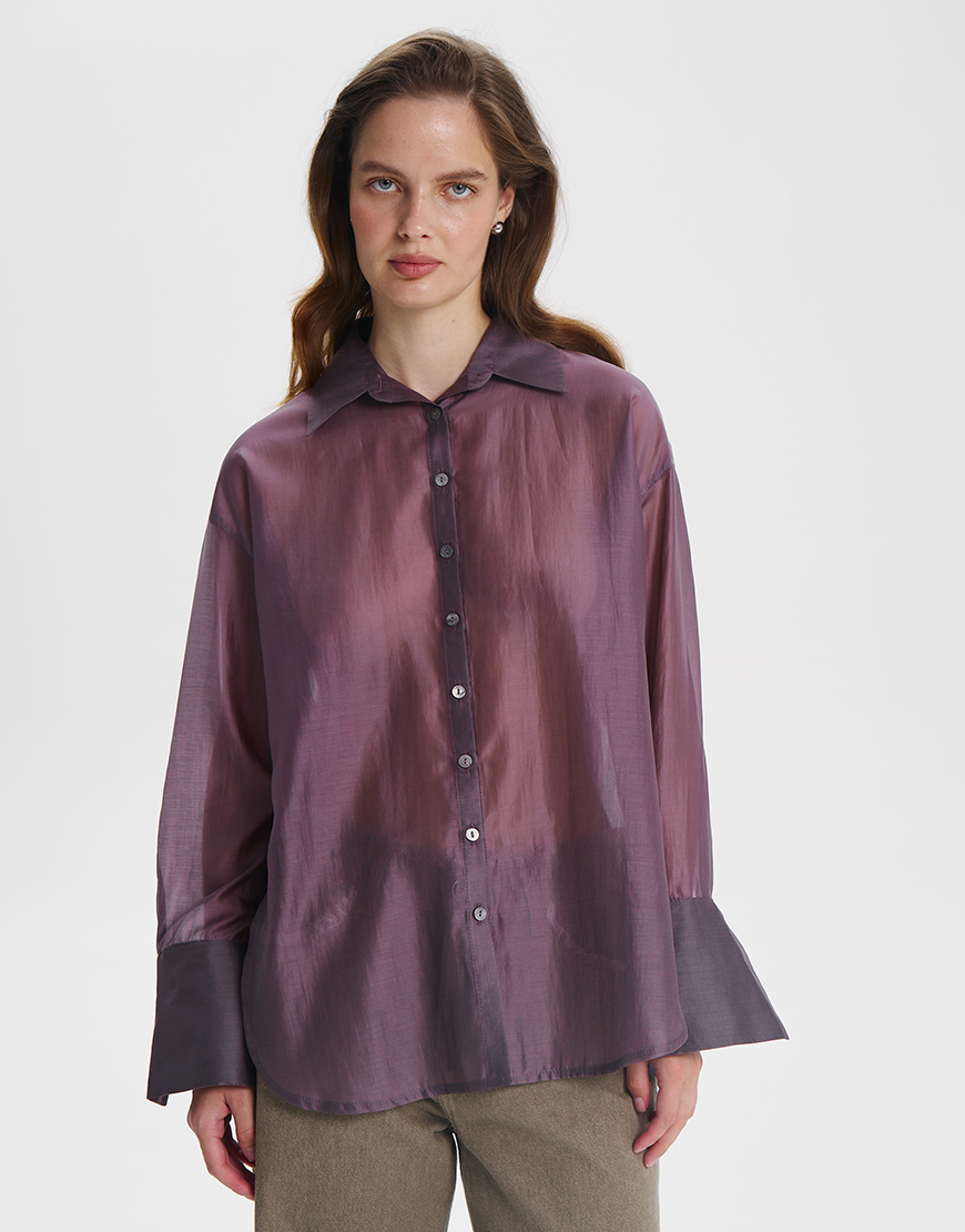 Доставка протягом 2-5 робочих днівНапівпрозора сорочка винного відтінку, як акварель на мокрому папері. Виконана з напівпрозорого тенселу. Ідеальна для офісних багатошарових образів або вечірньої витонченості. Меланхолія дощу тут перетворюється на натхнення