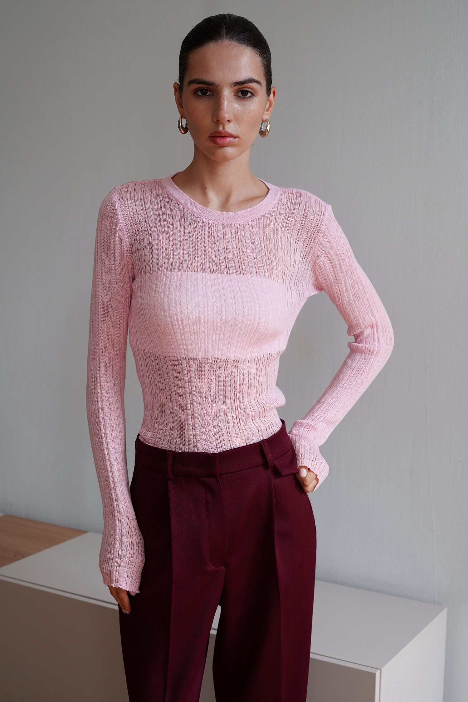 ДоставкаНапівпрозорий рожевий джемпер з рельєфною в’язкою.