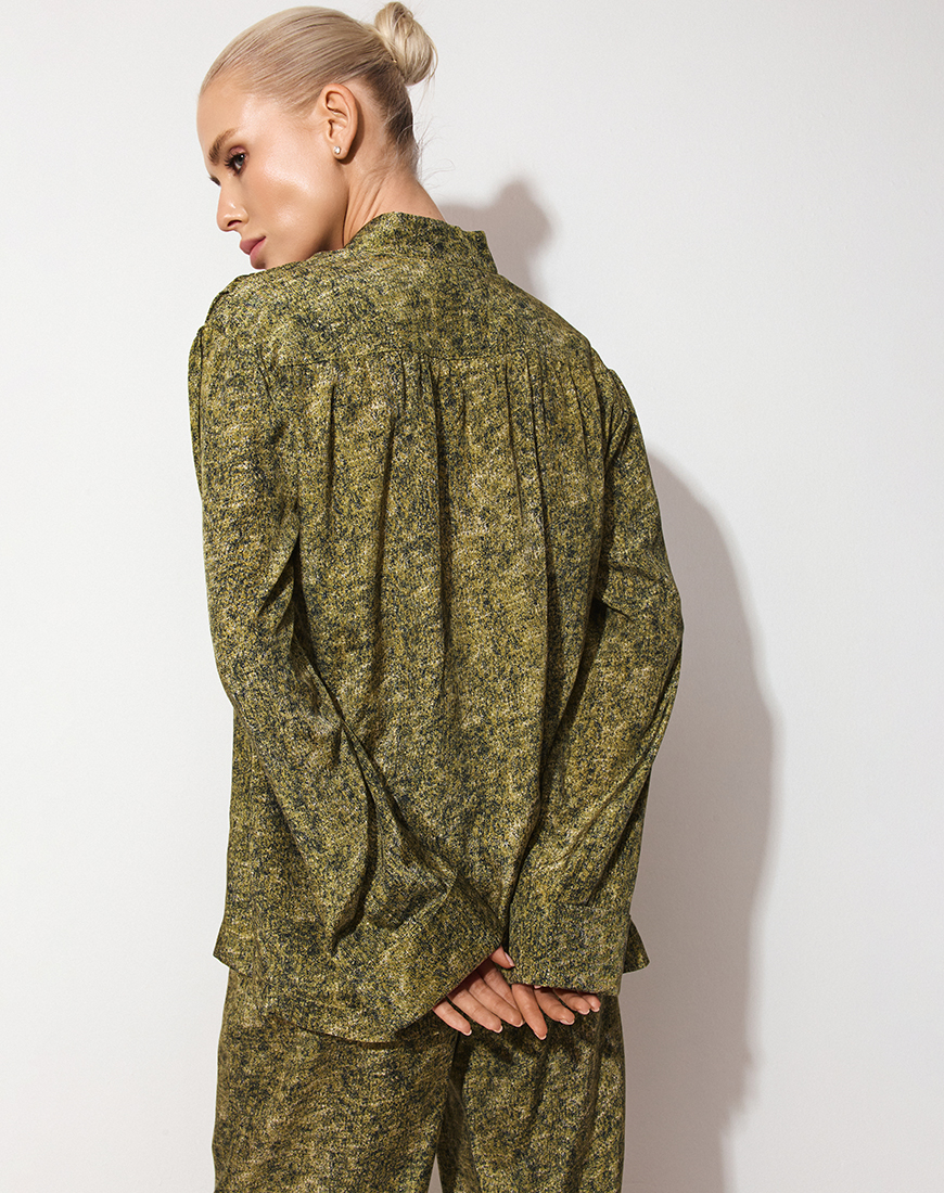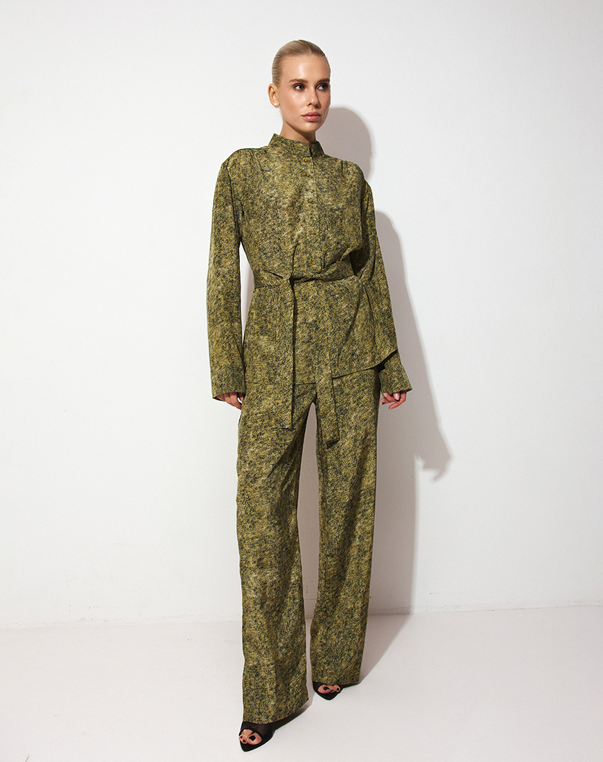 Доставка впродовж 5-7 робочих днівКостюм із легкої тканини у благородному оливково-зеленому відтінку з розмитим принтом.