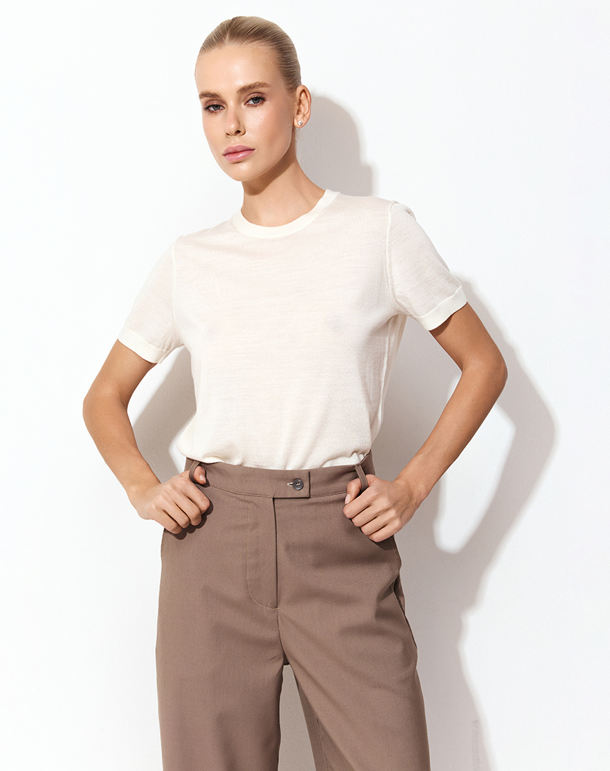 Доставка впродовж 5-7 робочих днівТоп молочного кольору з мериносової вовни з короткими рукавами, ніжний і комфортний базовий елемент гардероба.