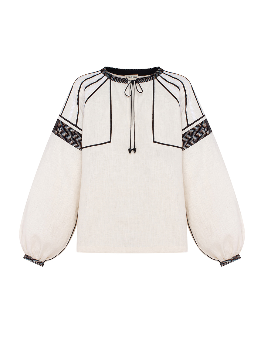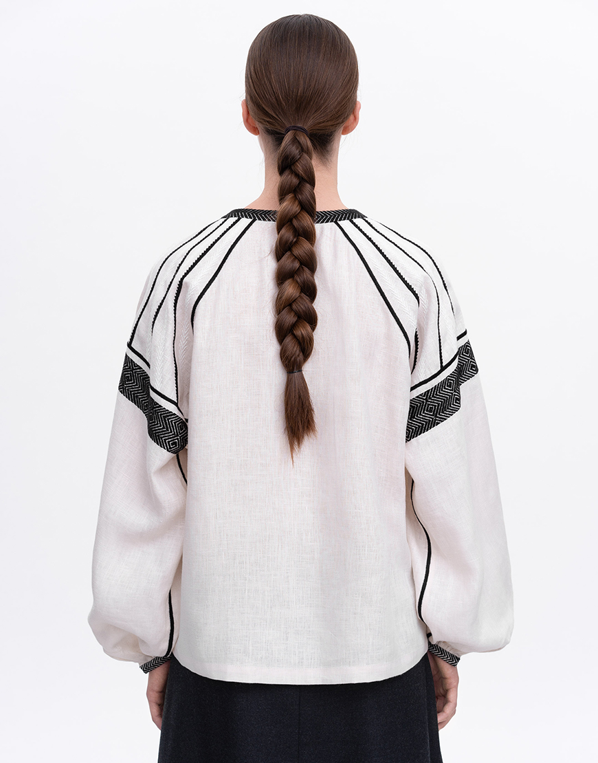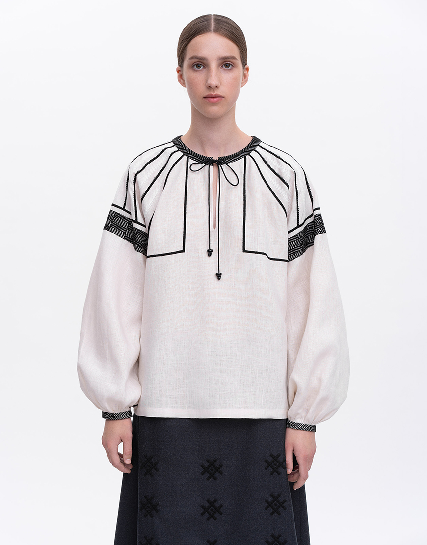 Лляна сорочка, натхненна орнаментальною композицією мізинського браслета — однієї з найдавніших археологічних знахідок на території України.