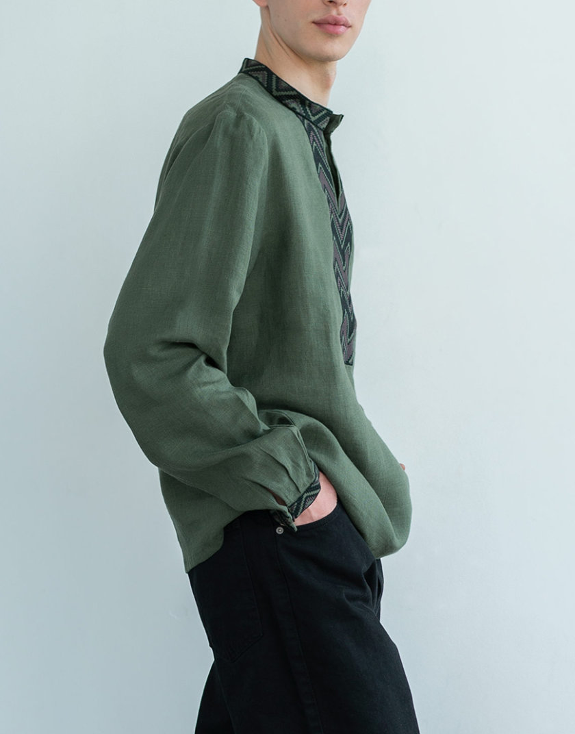 Пряма сорочка з коміром стійкою, спереду розріз із застібкою на кнопку. Комір, пілочка та манжети оздоблені вишивкою. Спинка з кокеткою.