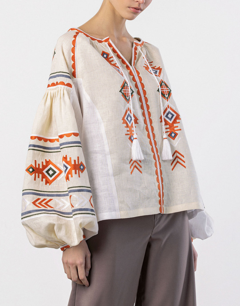 Доставка протягом 2-5 робочих днівСорочка з об’ємними рукавами та прихованими гудзиками спереду. Нижня частина рукава збирається на верхню декоративними складками. Низ рукавів збирається на манжети. Пілочка та спинка з рельєфами та контраснтними вставками. По центру пілочки декоративна планка, комір з завязками китицями спереду.
