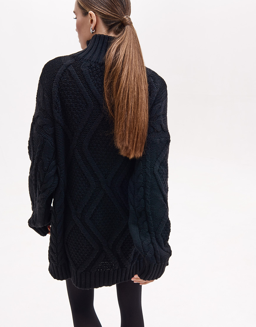 Доставка впродовж 3-10 робочих днівСветр з високою горловиною, вільного прямого крою з візерунком косами.