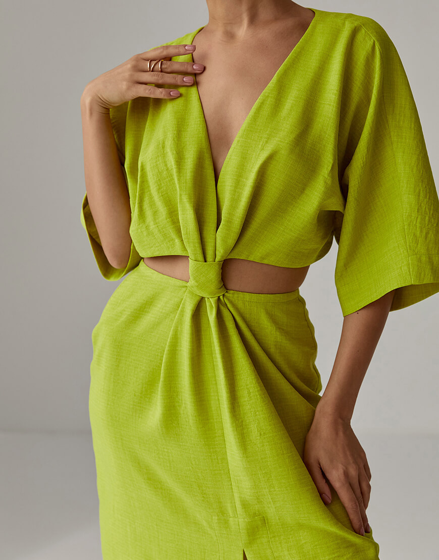 Об’ємний силуету сукні з V- подібним вирізом та розрізом спереду з’єднується на талії вузлом.
