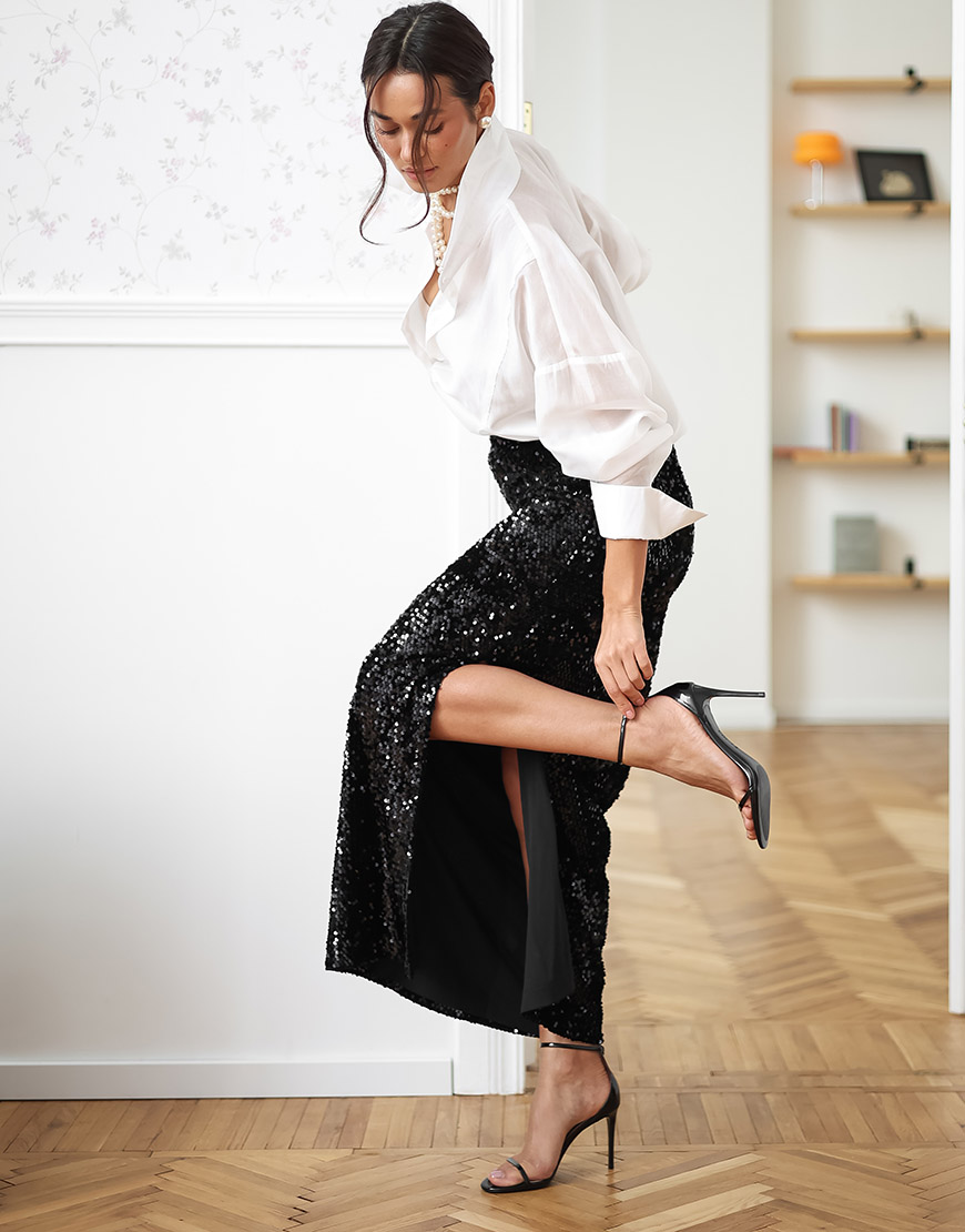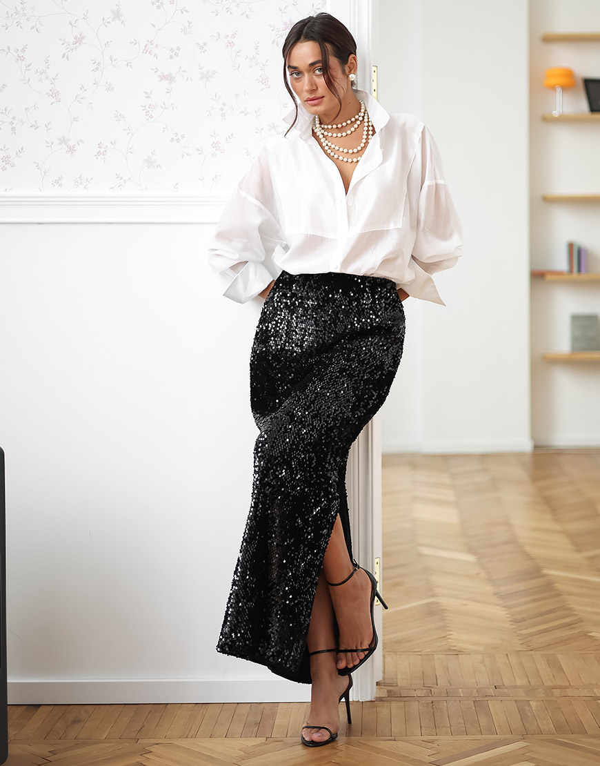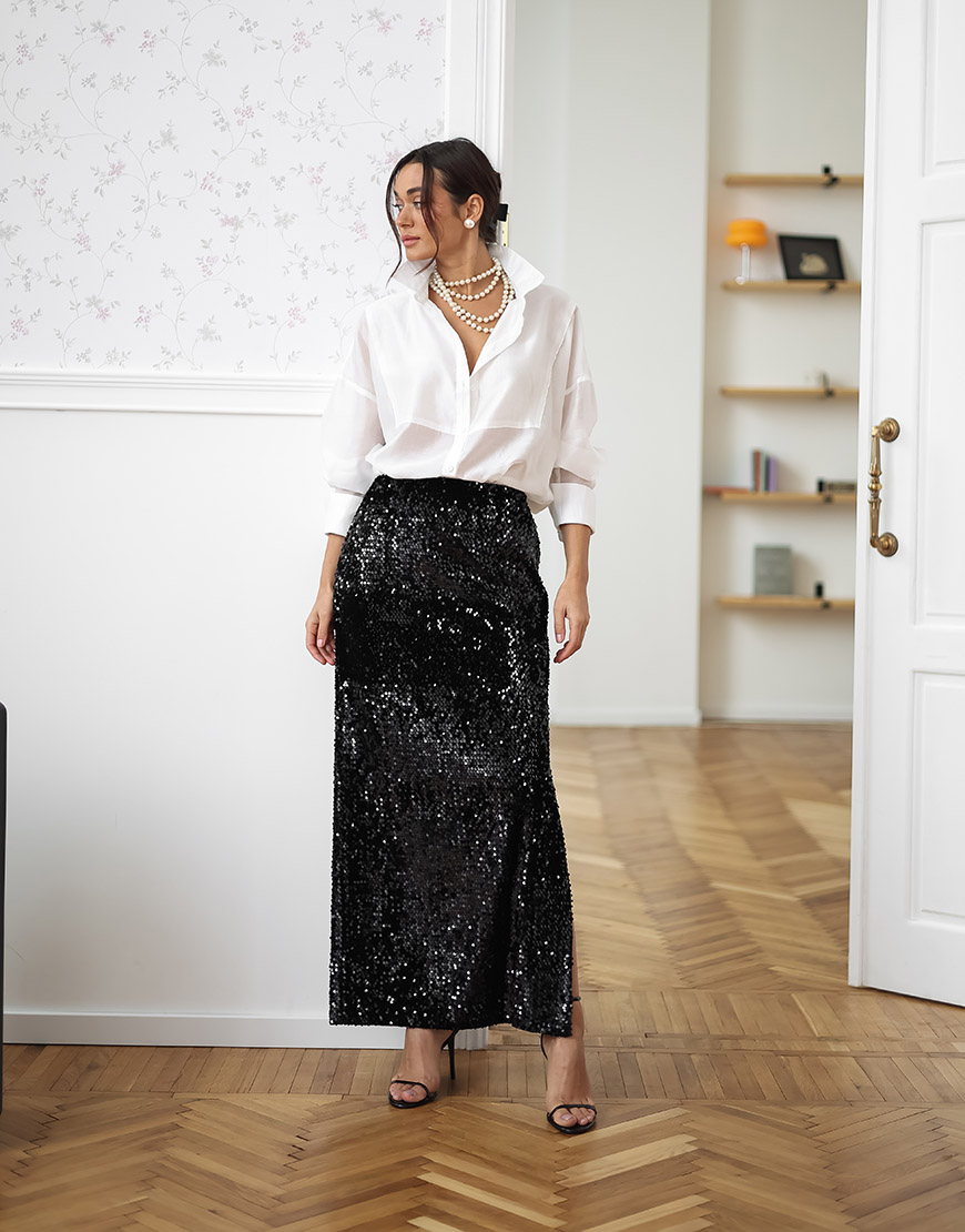 Доставка впродовж 2-5 робочих днівСпідниця-максі із велюрової таканини з паєтками, на підкладі, застібається на блискавку. Для регулювання об’єму талії всередині поясу має резинку. Тканина тягнеться!