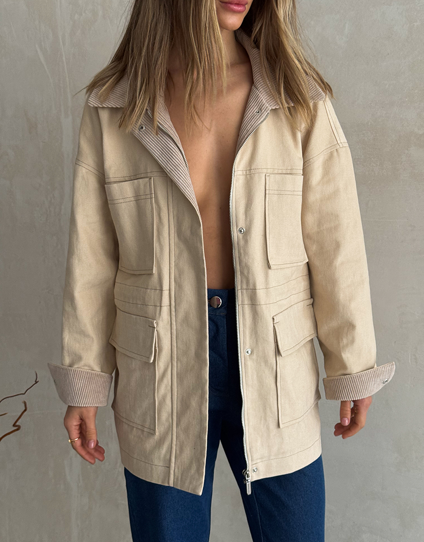 Доставка впродовж 2-5 робочих днівКуртка із бавовни на підкладі, з накладними карманами, контрастним коміром та манжетами