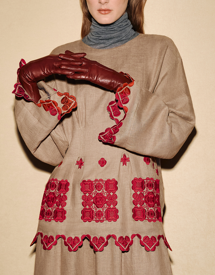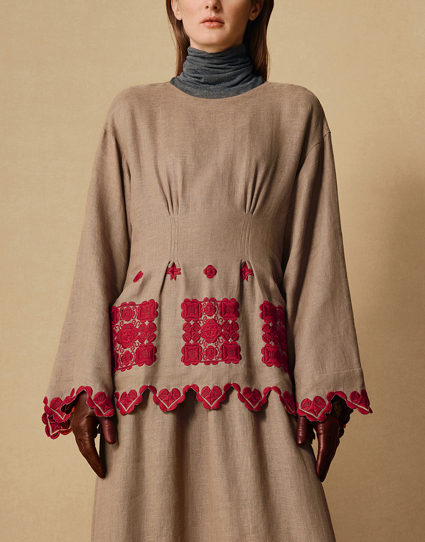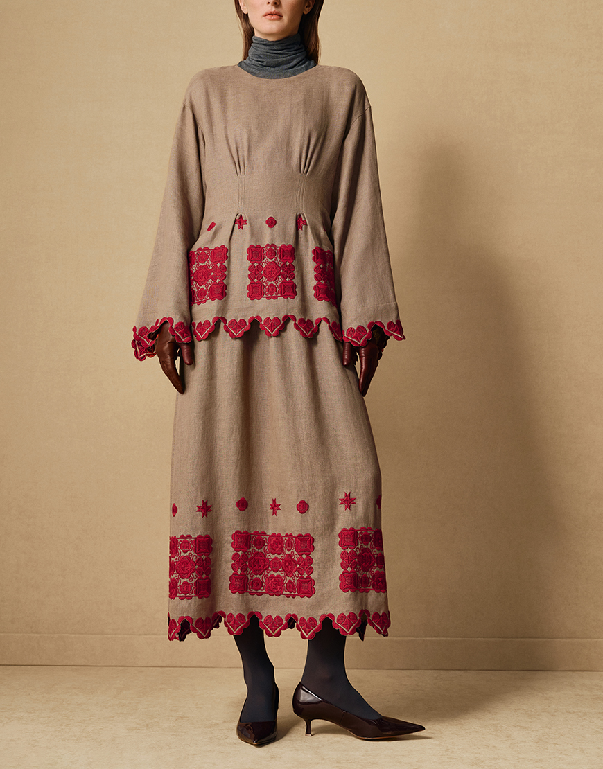 Лляна двошарова сукня з серцеподібними орнаментами хвилястими рядами на комірці, рукавах та подолі натхненні мотивами косівської кераміки.