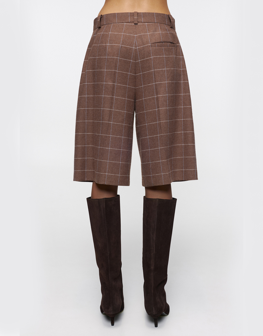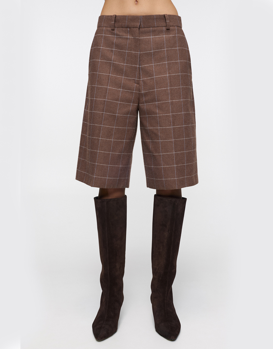 Доставка впродовж 5-7 робочих днівСтильні бермуди вільного крою у класичну клітинку теплого коричневого відтінку. Застібаються на блискавку та гачок. Ідеально поєднуються з жакетом у клітинку для створення елегантного костюма.