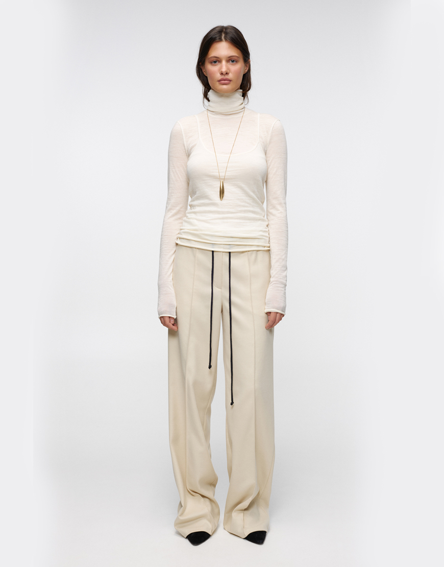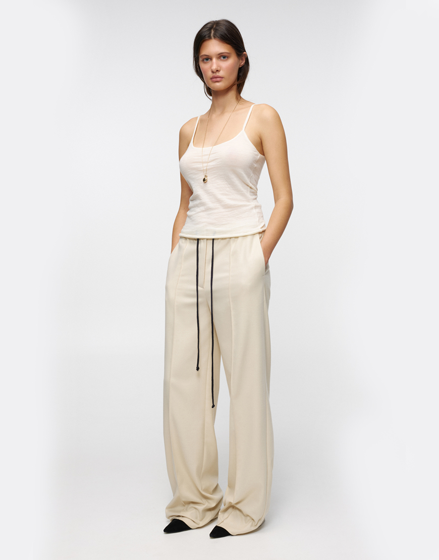 Доставка впродовж 5-7 робочих днівКомфортні штани вільного крою у молочному відтінку. Пояс на резинці з чорним бавовняним шнурком. Доповнені функціональними кишенями спереду та ззаду. Практична модель для створення затишних повсякденних образів. Виконані з м’якої костюмної тканини.