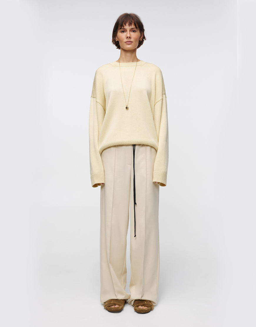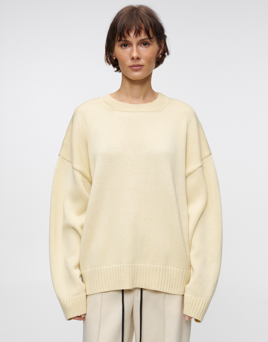 Доставка впродовж 5-7 робочих днівЕлегантний светрик оверсайз ніжного молочного відтінку з круглим вирізом. М’яка та тепла модель вільного крою для створення витончених повсякденних образів. Натуральний склад забезпечує комфорт та тепло.