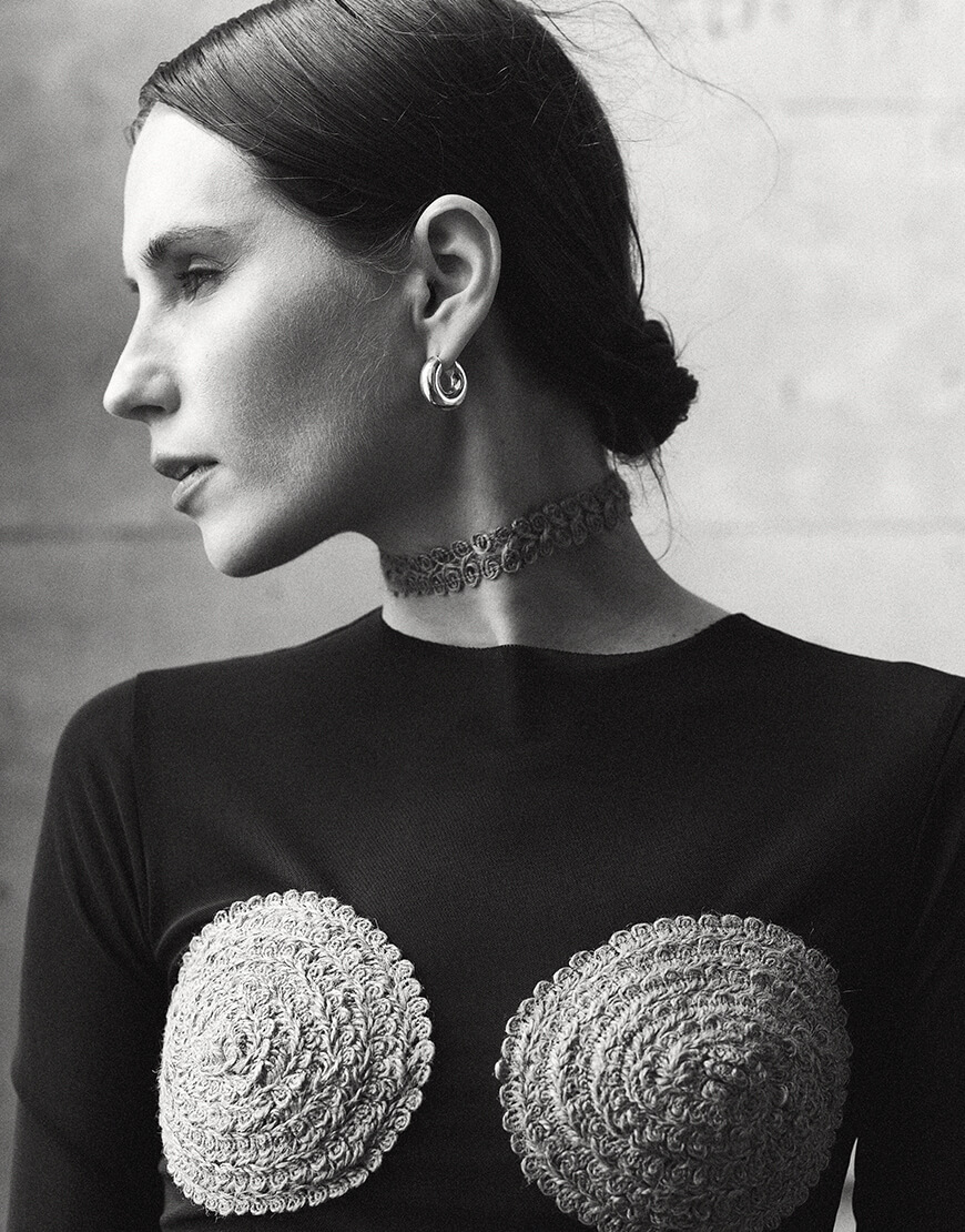 Виконаний із щільної еластичної сітки. Округлий виріз горловини, на грудях нашиті соломʼяні накладки, подовжені рукави, приталений силует. Зріст коригується за рахунок гачків.