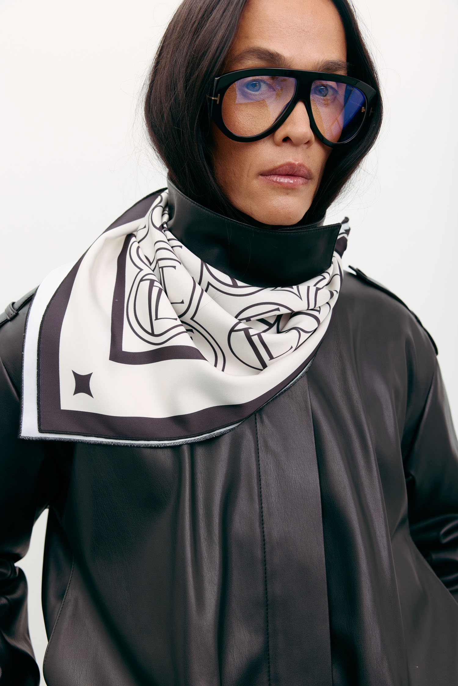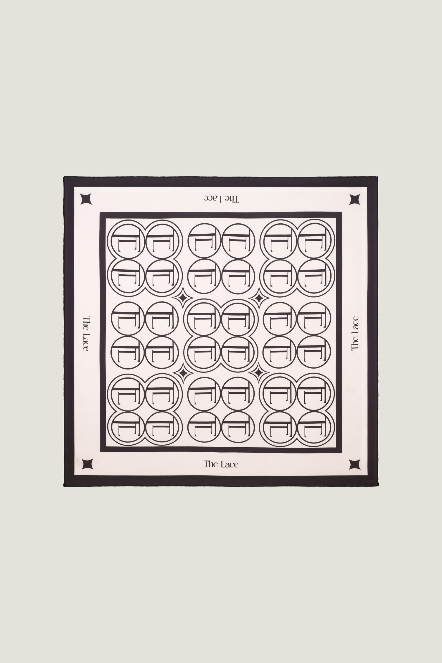 Сатинова хустка шоколадно‑молочного відтінку з фірмовим логотипом The Lace.