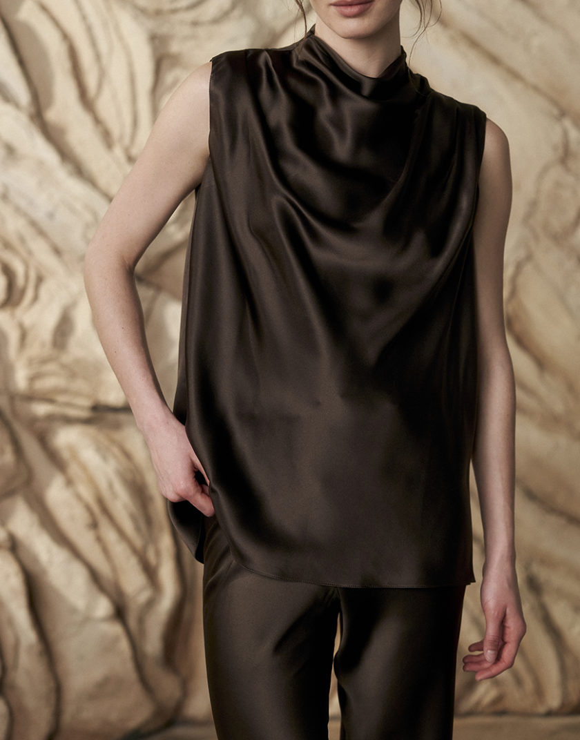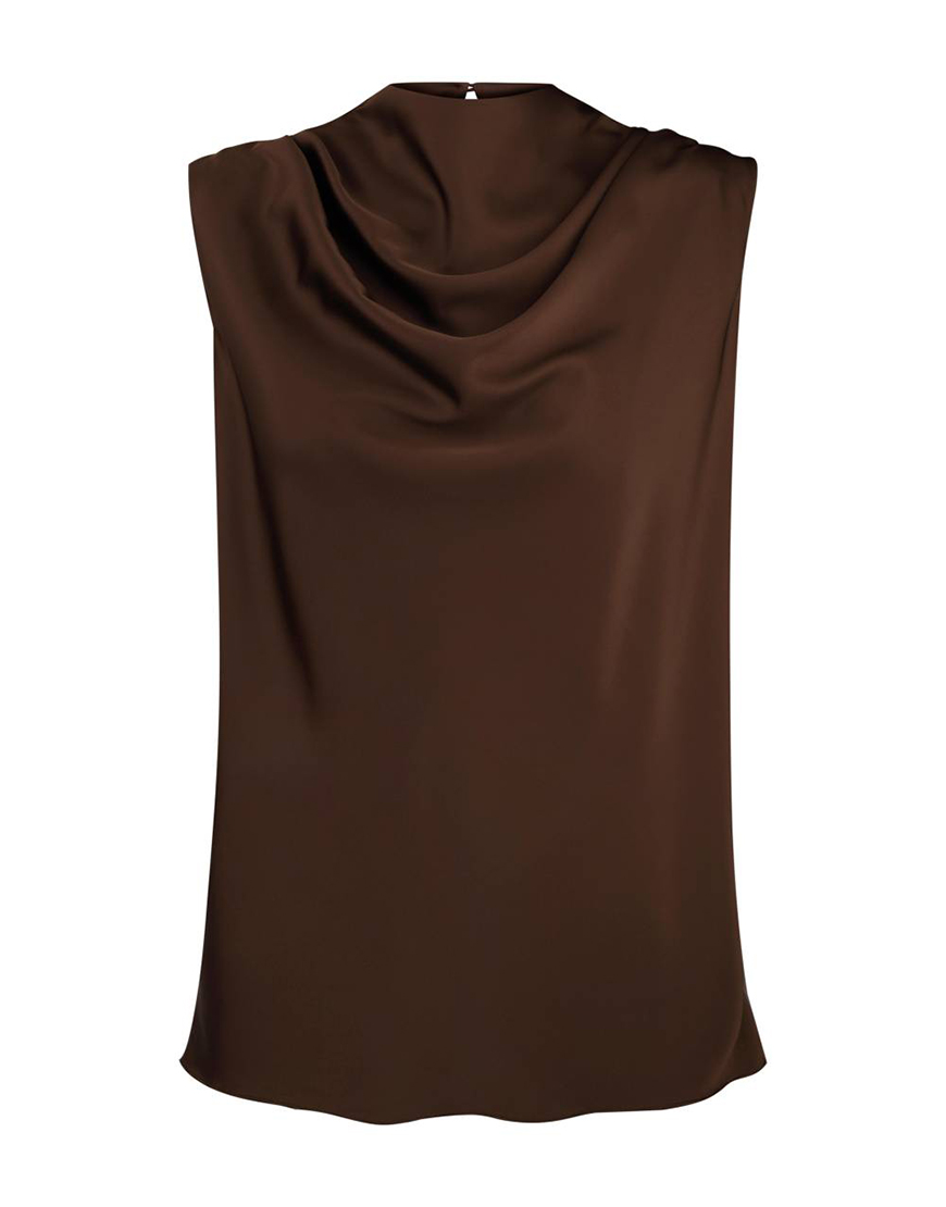 Топ без рукавів шоколадного кольору, має застібку на ґудзиках позаду виробу.