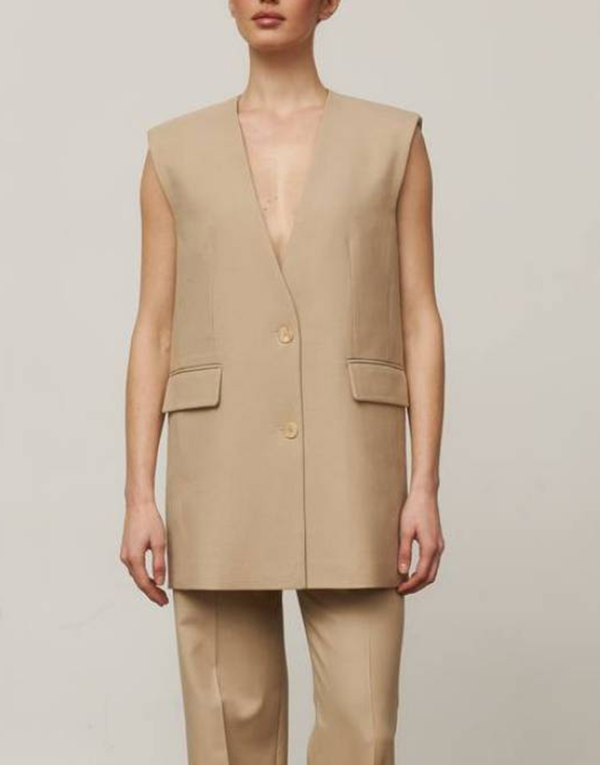 Бежевий жилет прямого крою має v образний виріз,застібається на ґудзиках спереду.