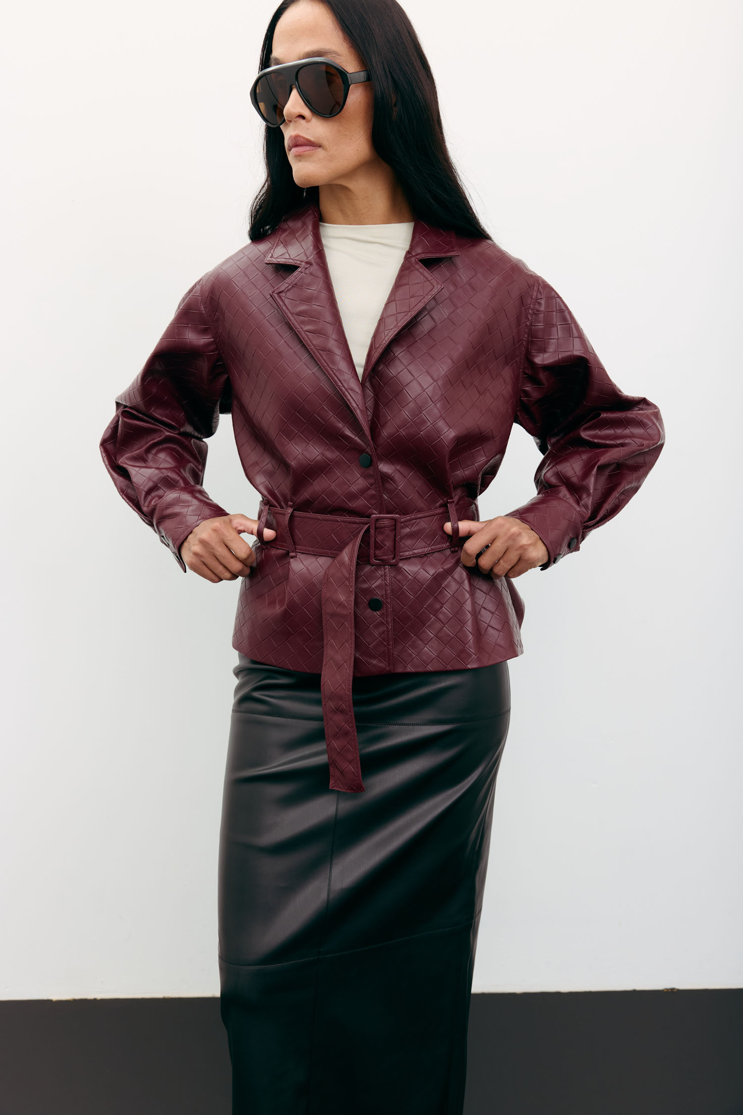 ДоставкаКуртка бордового відтінку пошита з фактурної еко-шкіри з ефектом плетіння. Силует передбачає об’ємні рукави з манжетами. Застібається на кнопки і доповнена поясом у тон, що підкреслює лінію талії. Манжети акуратно формують кромку рукавів і зберігають їхній об’єм.