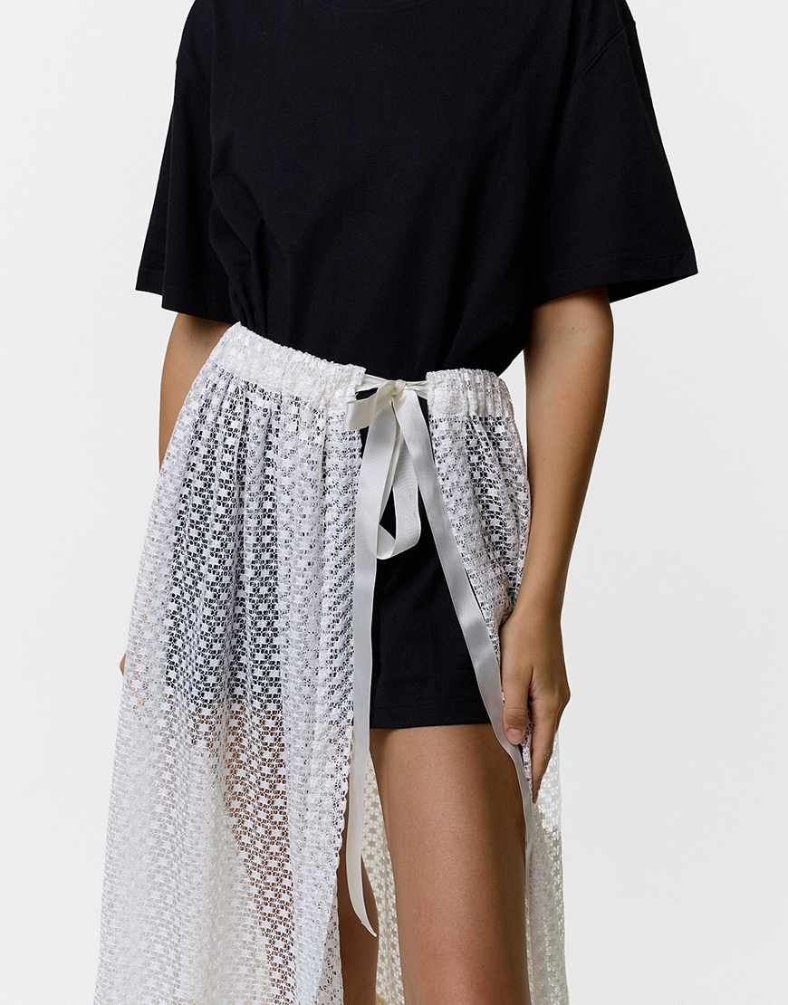 Доставка протягом 3-5 робочих днівСпідниця на завʼязках з вінтажного мережива вільного крою, пояс на резинці, рюша по подолу спідниці.