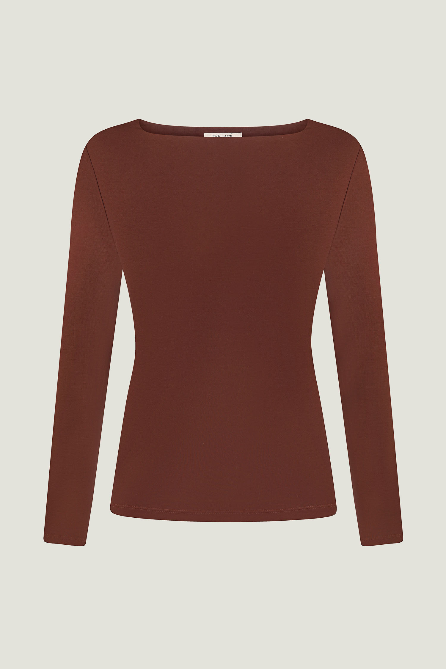 Лонгслів мінімалістичного стилю в насиченому шоколадному кольорі. Приталений крій поєднано з широким вирізом горловини. Поєднання зі силуетною спідницею в тон формує цілісний образ.