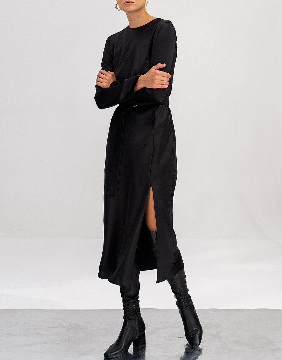Оригінальна сукня з ніжної шовковистої тканини. Сукня крою по-косому, що забезпечує ідеальне, м’яке прилягання по фігурі. Сукня виконана на підкладці і декорована розрізом по нозі. Застібається ззаду на ґудзик.