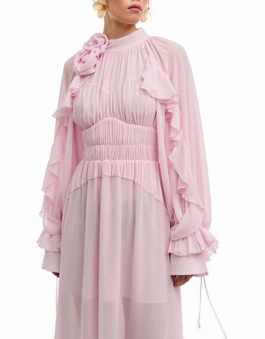 Сукня-максі з розкішного віскозного шифону. Сукня виконана на підкладці. Об’ємні рукава з широкими манжетами та воланами. Фігурні вирізи з драпіруваннями по ліфу та талії надають сукні особливої витонченості. Лінія талії виконана на резинці. Горловина сукні декорована квітами ручної роботи. Преміальна технологія виконання з усіма закритими швами. Довжина сукні 130 см.