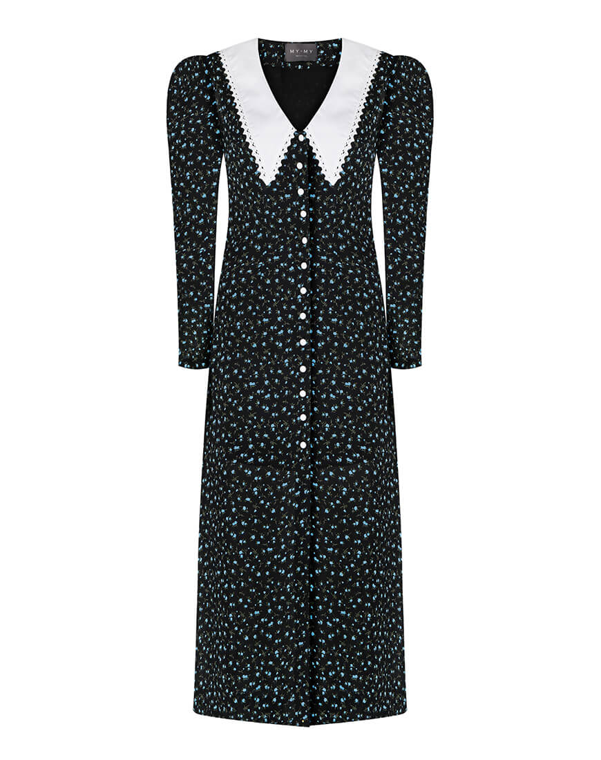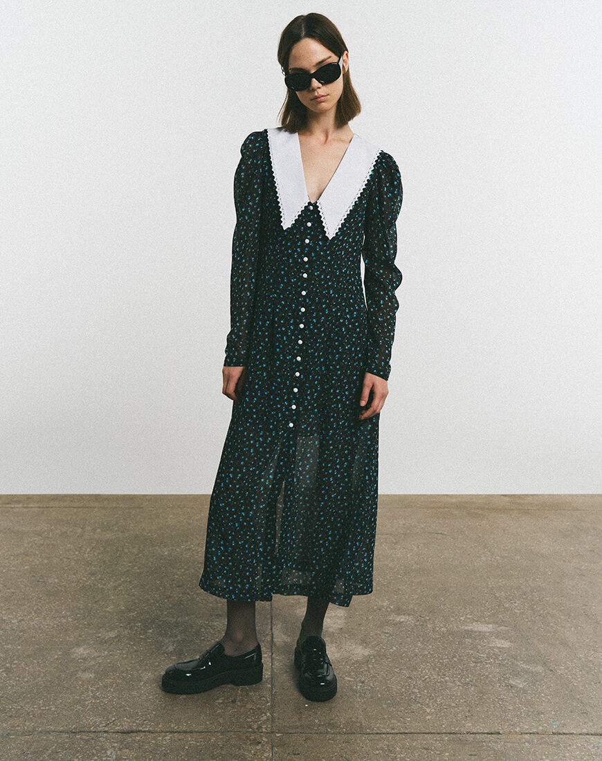 Сукня-міді з розкішного віскозного шифону. Сукня виконана на підкладці. Рукава-ліхтарики створюють додатковий об’єм. Білий комірець, що оздоблений мереживом по периметру, надає сукні особливої витонченості. Сукня застібається спереду на контрастні білі гудзики. Довжина сукні 128 см.