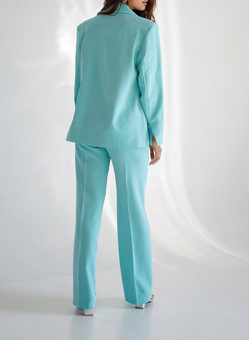 Розкішний костюм із м’якої, літньої тканини. Подовжений двобортний піджак прямого крою повністю на підкладці. Штани із завищеною талією, розкльошеного крою, застібаються на потаємну блискавку та гачок. Костюм ідеально поєднується як із взуттям на підборах, так і на плоскій підошві.
