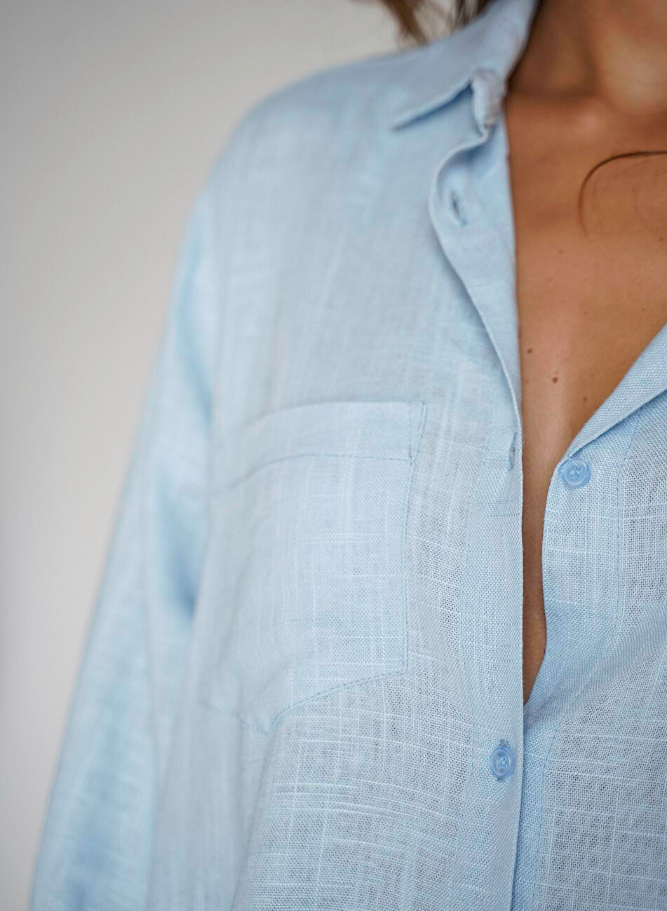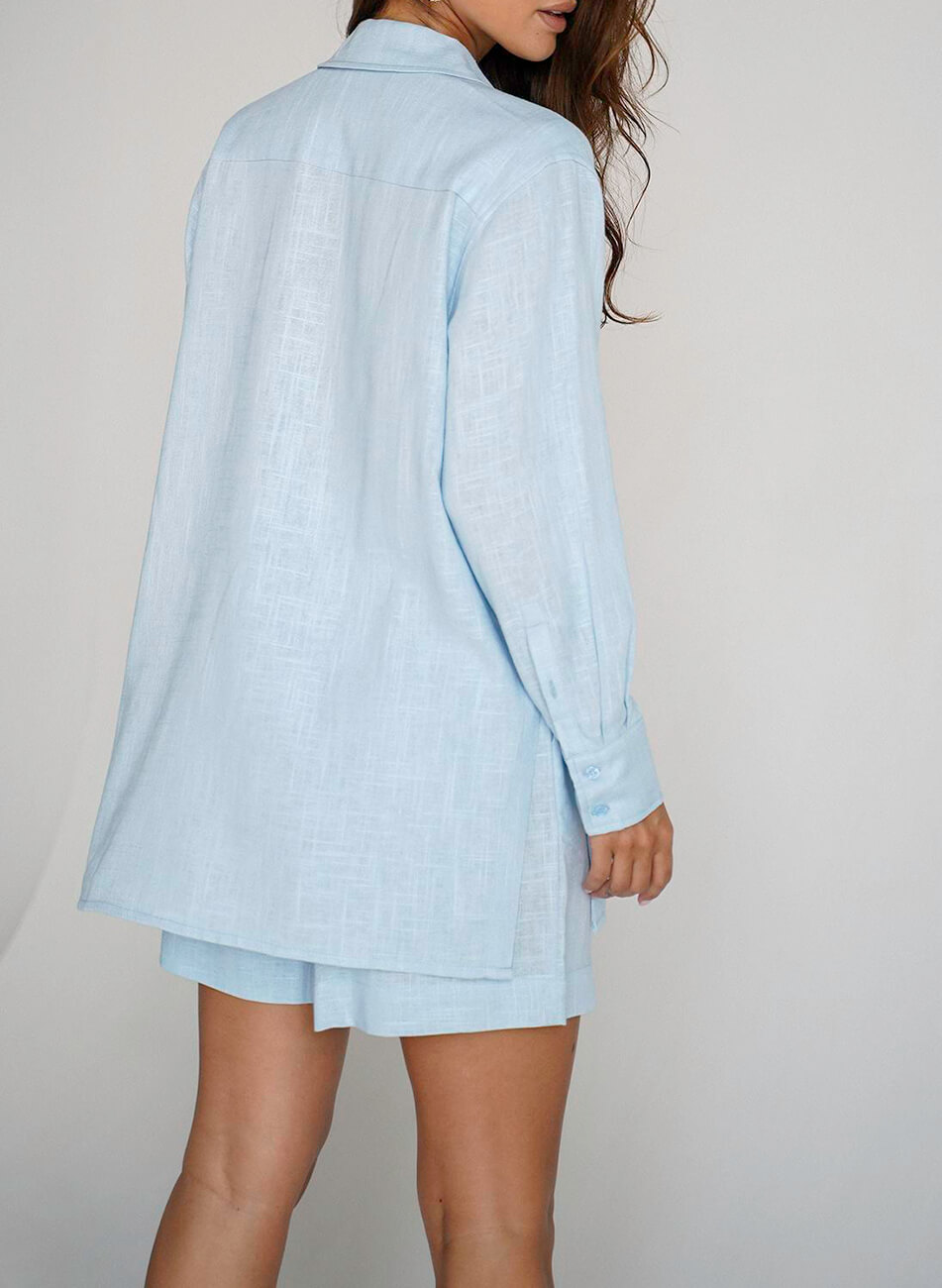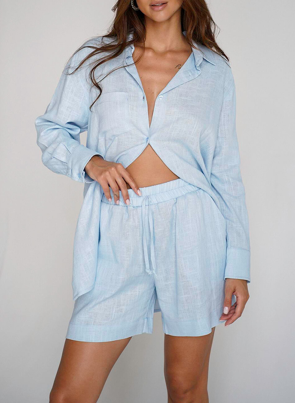 Зручний лляний костюм: подовжена оверсайз сорочка, ніби з чоловічого плеча, та об’ємні шорти з високою лінією талії, вільного крою, трохи розширені до низу та кишенями з боків. Костюм стане прекрасним компаньйоном у відпустці.