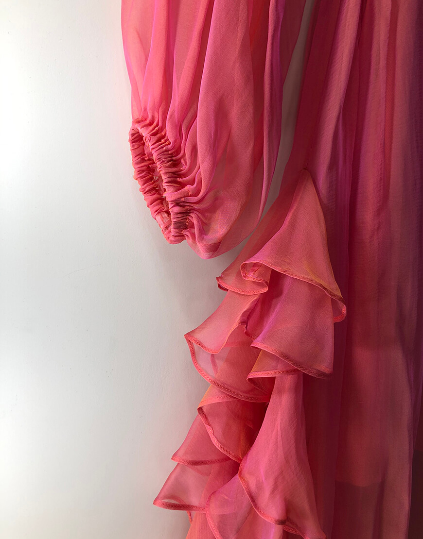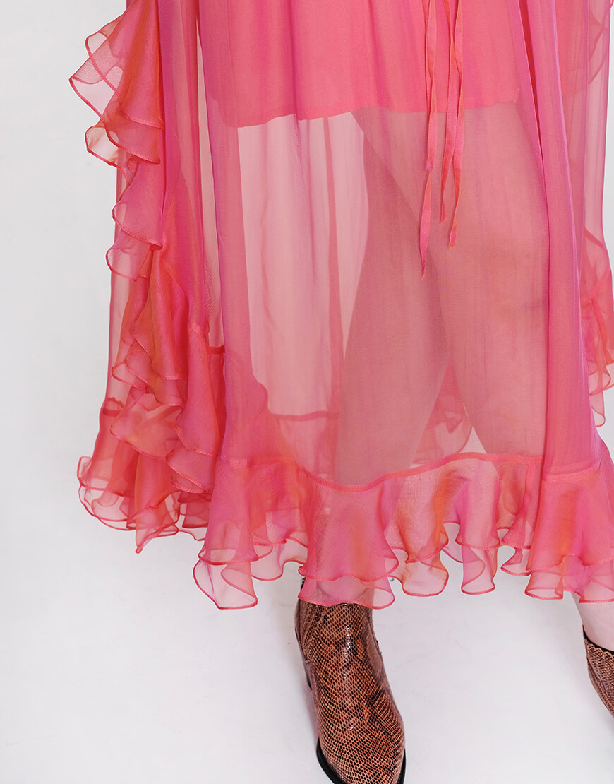 Летюча шифонова сукня “Orquidea” з шифону хамелеона з декоративним шарфом і подвійними воланами по низу. до сукні йде окремий знімний чохол-підкладка з віскози на регуляторах.